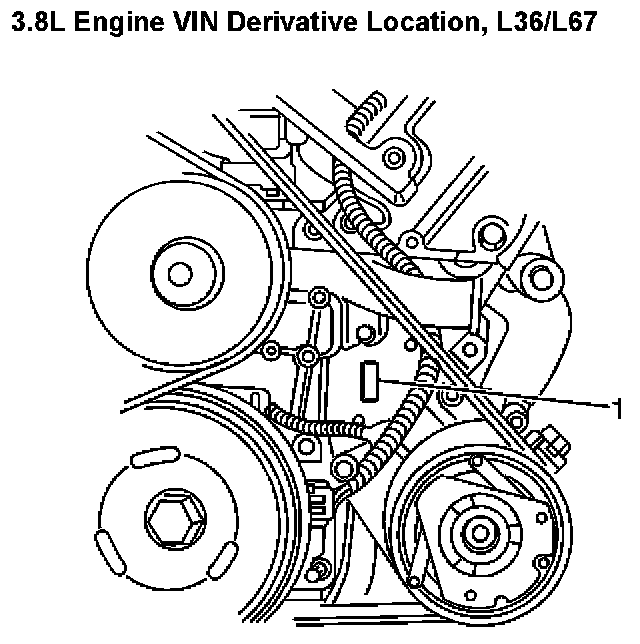 The secondary location (1) of the VIN derivative for the 3800 engines is below the water pump on the engine block.