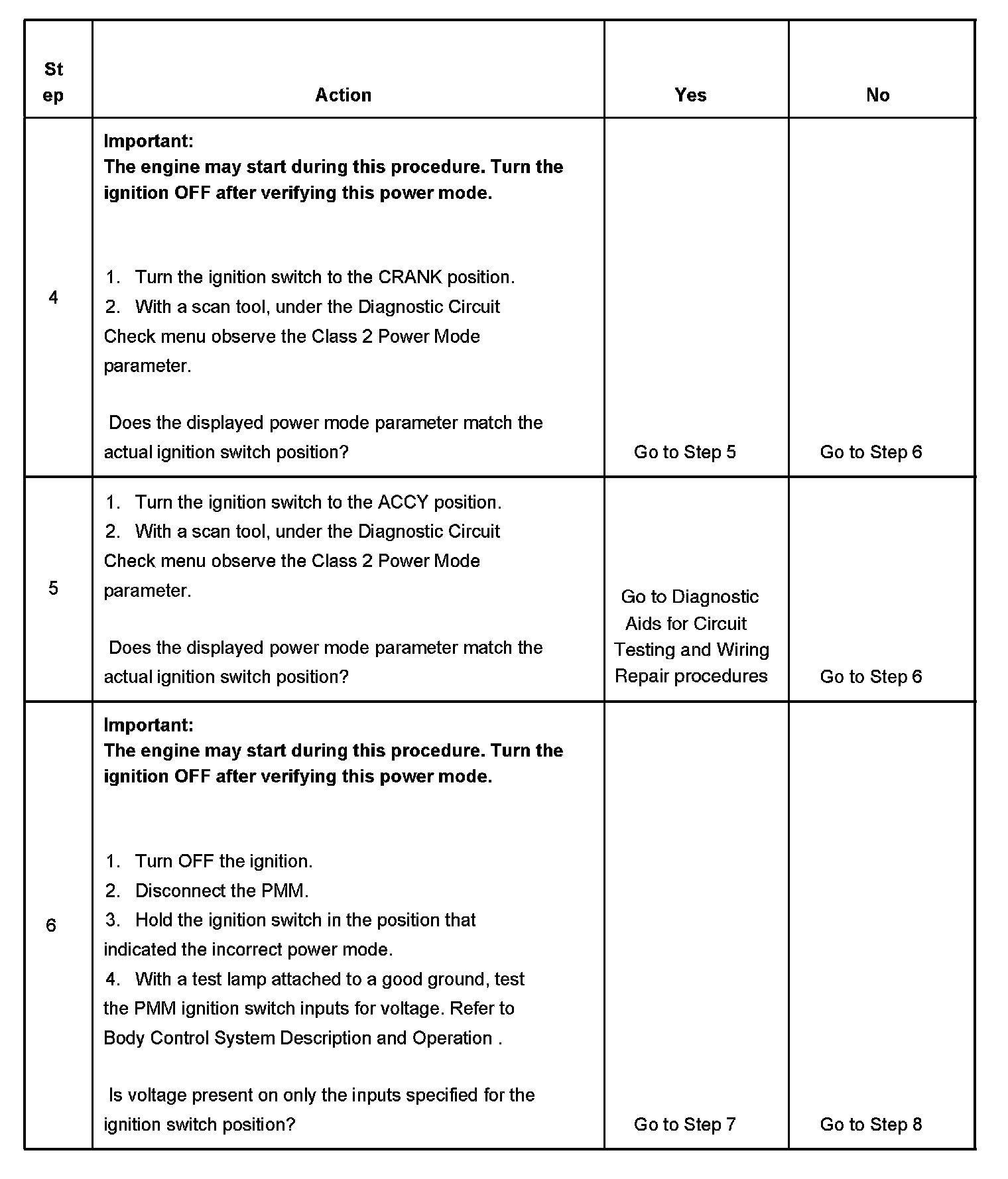 Normal vehicle class 2 communications and module operations will not begin until the system power mode has been identified. Discrete wires from the ignition switch contacts are monitored by the power mode master (PMM) module in order to determine the correct power mode. The PMM communicates the system power mode to all class 2 modules on the class 2 serial data line. Refer to Body Control System Description and Operation to identify which module is the PMM and the applicable power mode look up table.