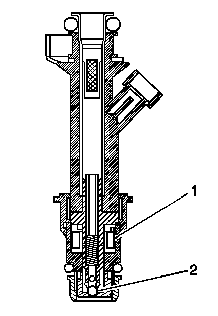 The fuel injector assembly is a solenoid operated device, controlled by the PCM, that meters pressurized fuel to a single engine cylinder. The PCM energizes the high-impedance (12.0 ohms) injector solenoid (2) to open a normally closed ball valve (3). This allows fuel to flow into the top of the injector, past the ball valve, and through a director plate at the injector outlet. The director plate has four machined holes that control the fuel flow, generating a spray of finely atomized fuel at the injector tip. Fuel from the injector tip is directed at the intake valve, causing the fuel to become further atomized and vaporized before entering the combustion chamber. An injector stuck partly open can cause a loss of pressure after engine shutdown. Consequently, long cranking times would be noticed on some engines.