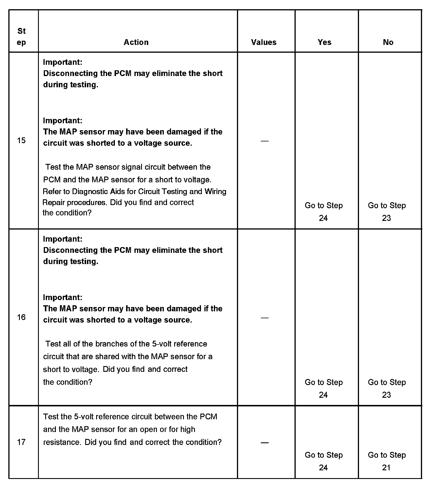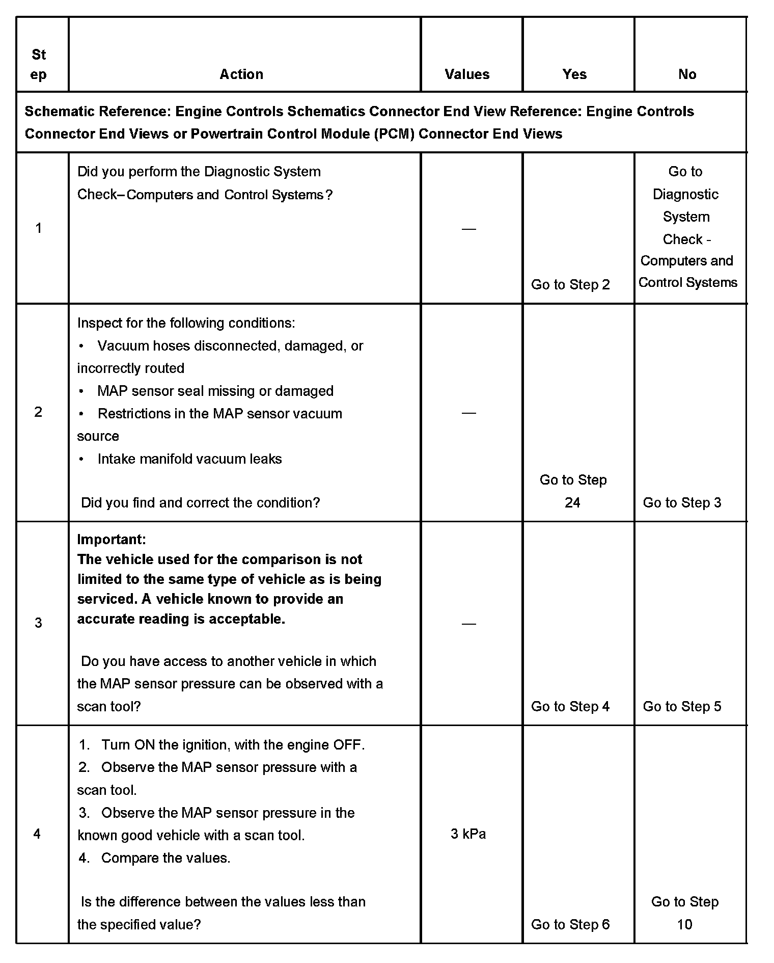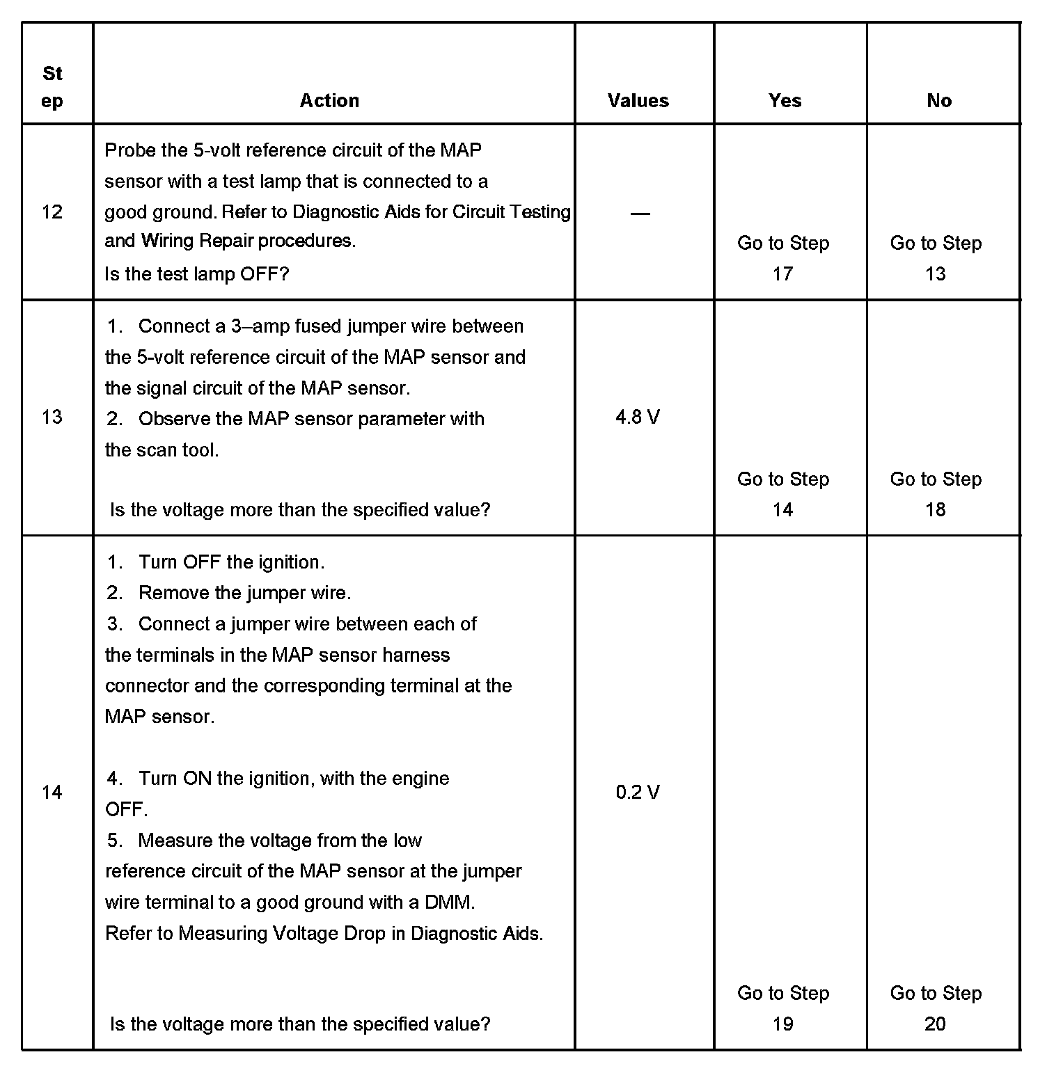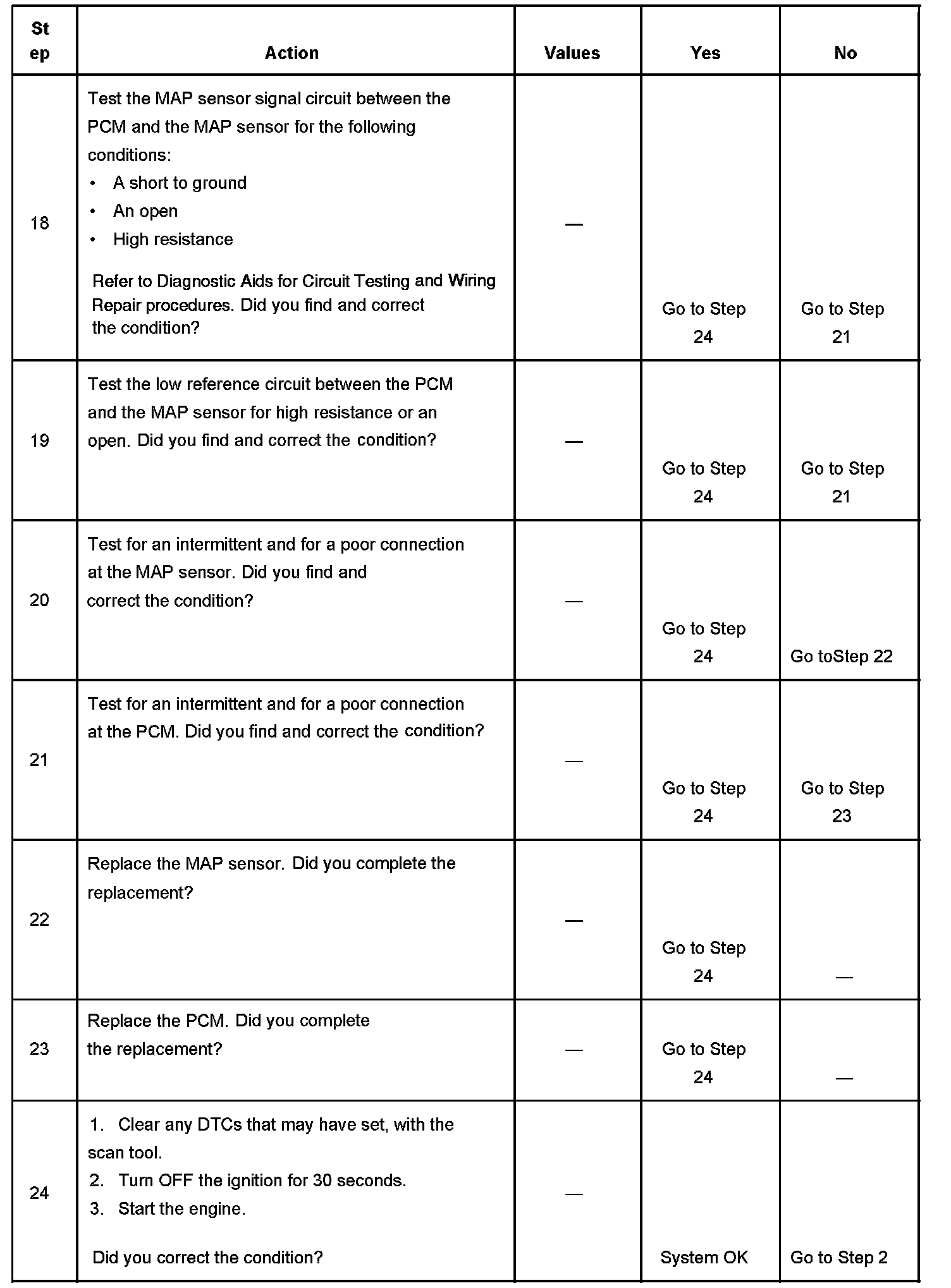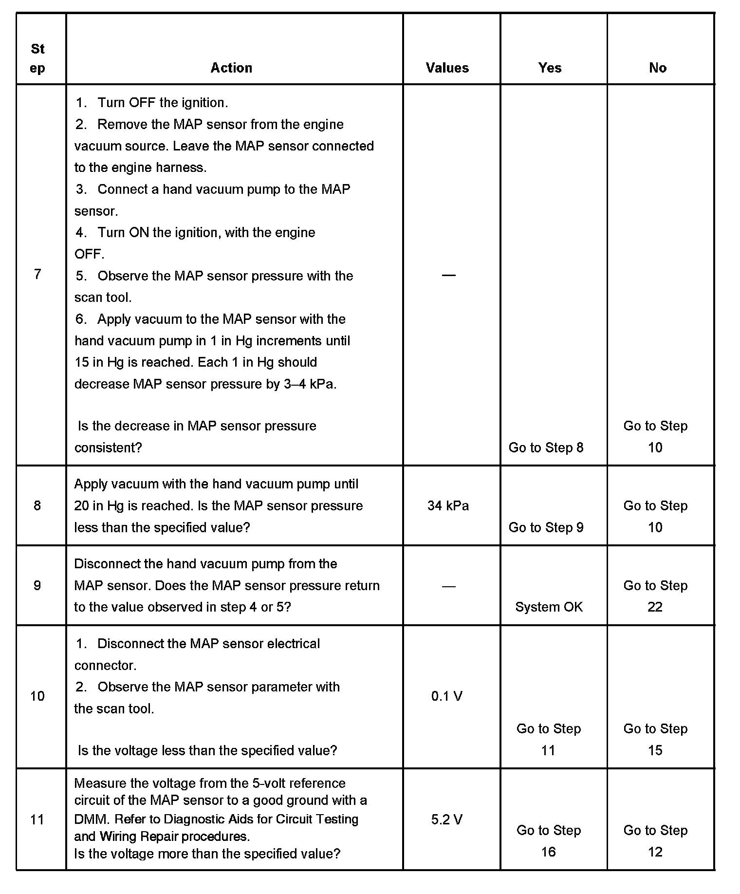 The manifold absolute pressure (MAP) sensor responds to changes in intake manifold pressure which gives an indication of the engine load. The MAP sensor has a 5-volt reference circuit, a low reference circuit, and a signal circuit. The powertrain control module (PCM) supplies 5 volts to the MAP sensor on the 5-volt reference circuit and provides a ground on the low reference circuit. The MAP sensor provides a signal to the PCM on the MAP sensor signal circuit, which is relative to the pressure changes in the manifold. With low MAP, such as during idle or deceleration, the PCM should detect a low MAP sensor signal voltage. With high MAP, such as ignition ON, engine OFF or wide open throttle (WOT), the PCM should detect a high MAP sensor signal voltage. This MAP sensor will indicate pressure between 10 and 104 kPa. The MAP sensor is also used in order to calculate the barometric pressure (BARO) when the ignition switch is turned ON, with the engine OFF. The BARO reading may also be updated whenever the engine is operated at WOT. The PCM monitors the MAP sensor signal for voltage outside of the normal range. IF the PCM detects a MAP sensor signal voltage that is excessively low, DTC P0107 sets. If the PCM detects a MAP sensor signal voltage that is excessively high DTC P0108 sets.