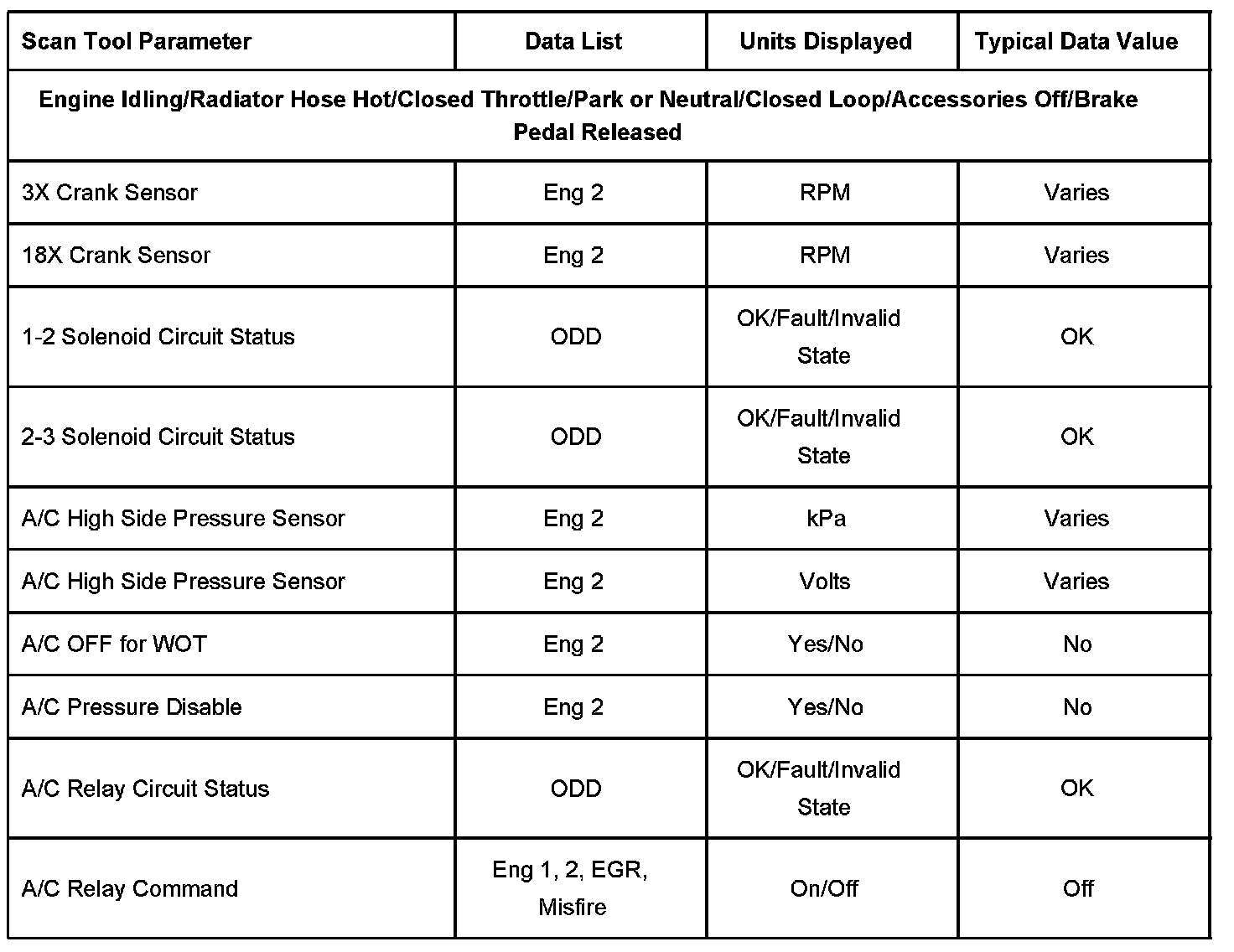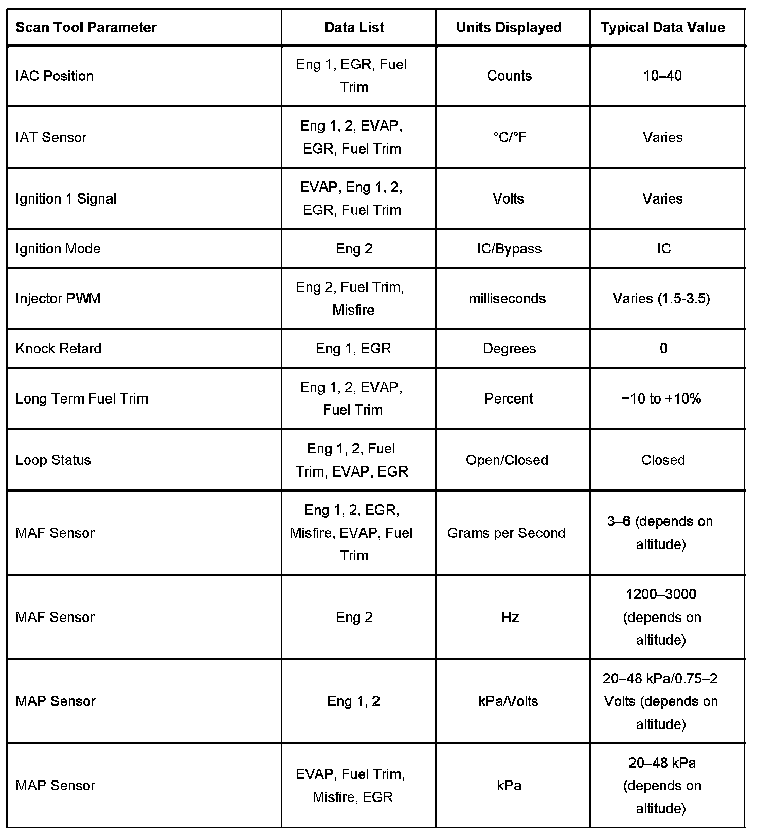 Scan tool values from a properly running engine may be used for comparison with the engine you are diagnosing. The Engine Scan Tool Data List represents values that would be seen on a normally running engine.