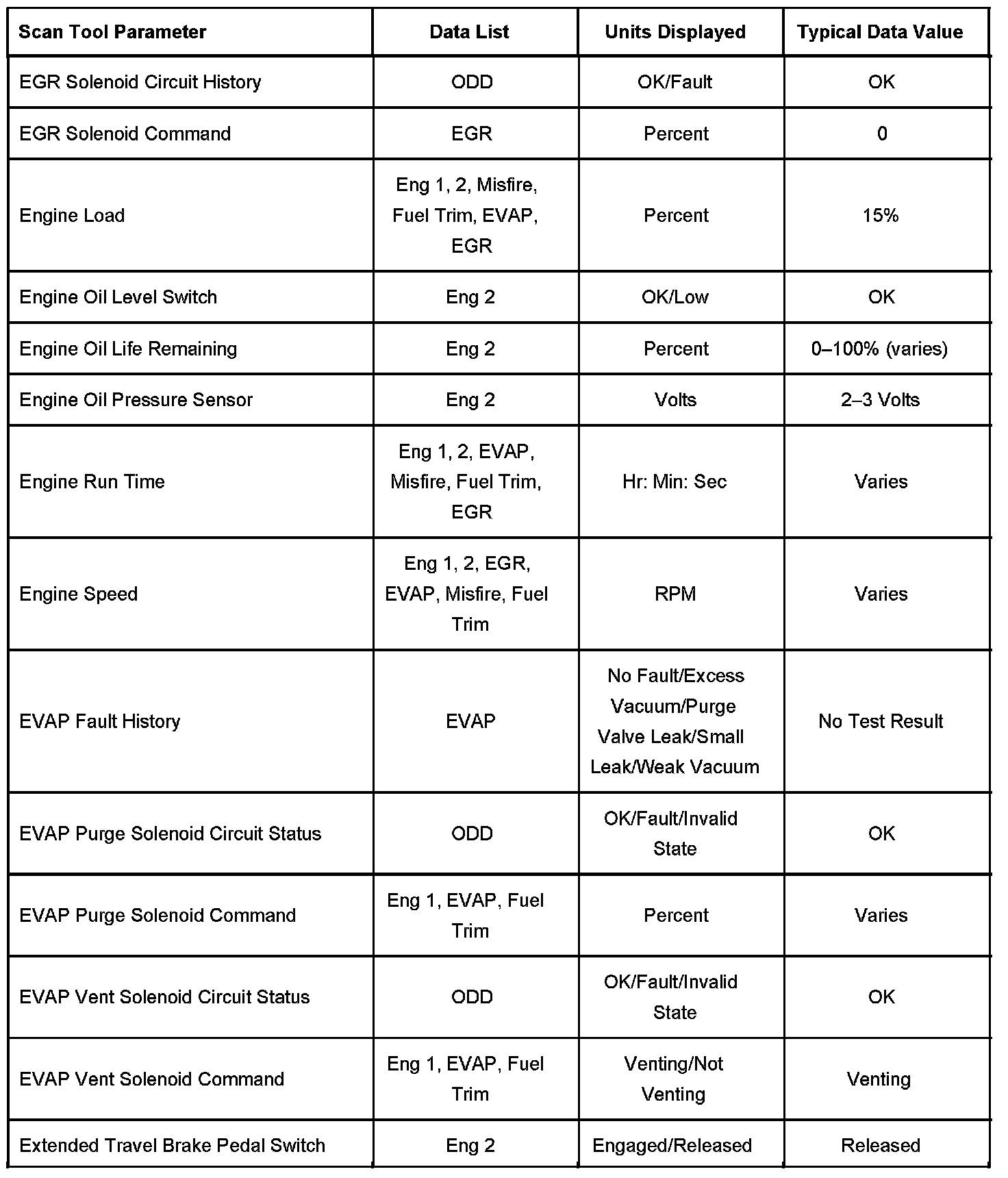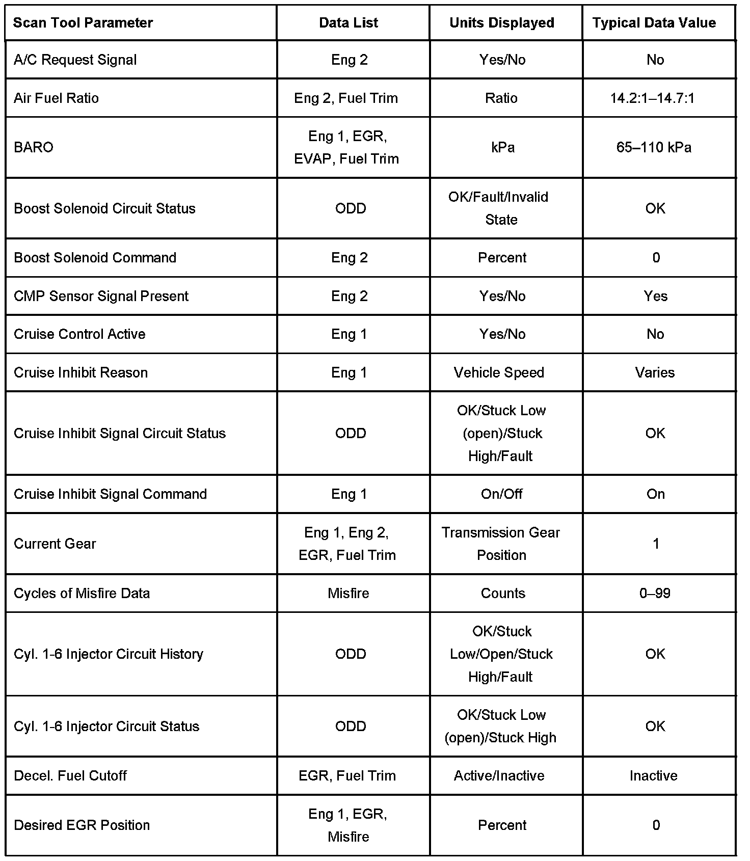 The Engine Scan Tool Data List contains all engine related parameters that are available on the scan tool. The list is arranged in alphabetical order. A given parameter may appear in any one of the data lists, and in some cases may appear more than once, or in more than one data list in order to group certain