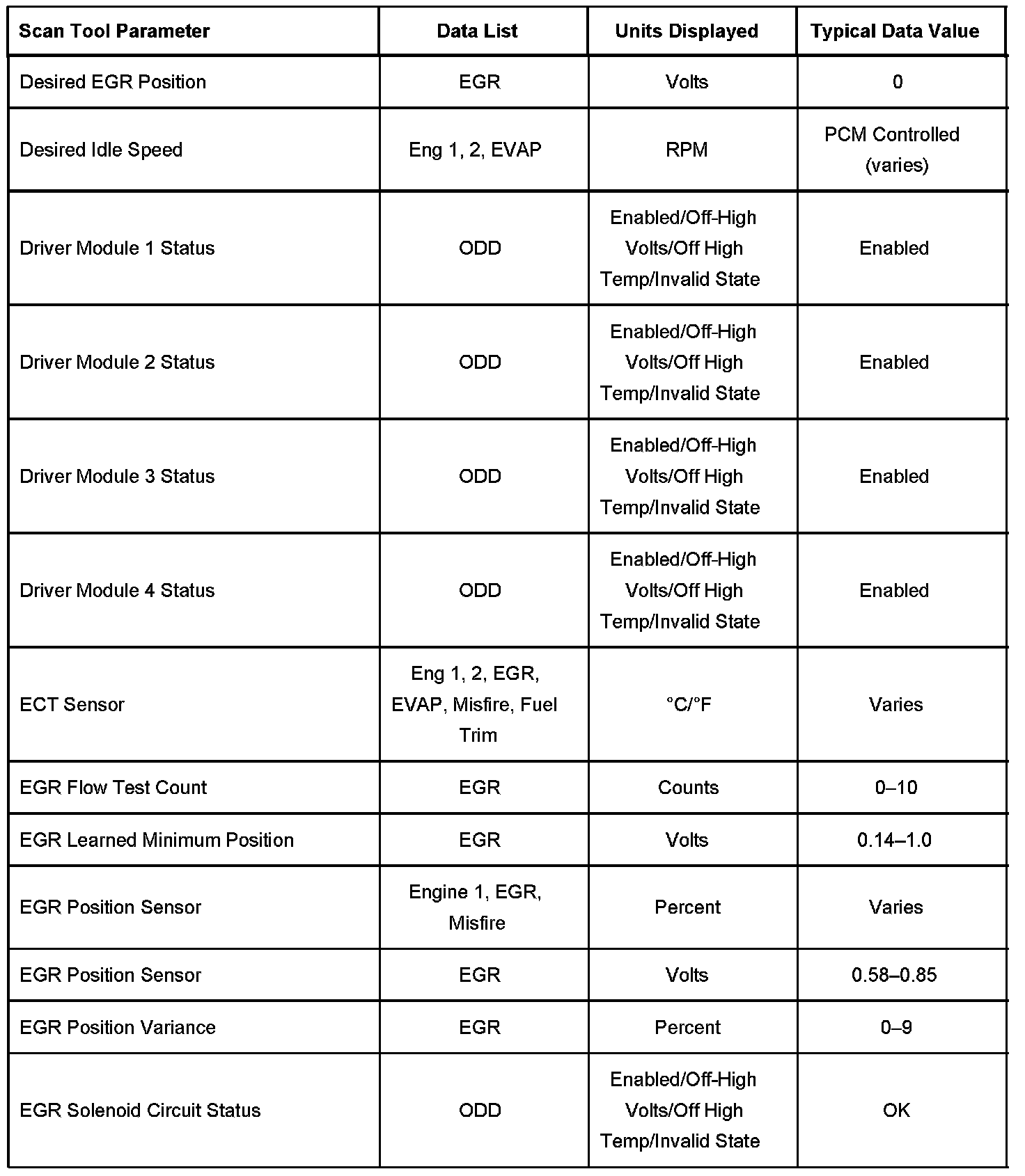 EGR - Exhaust Recirculation Valve Data