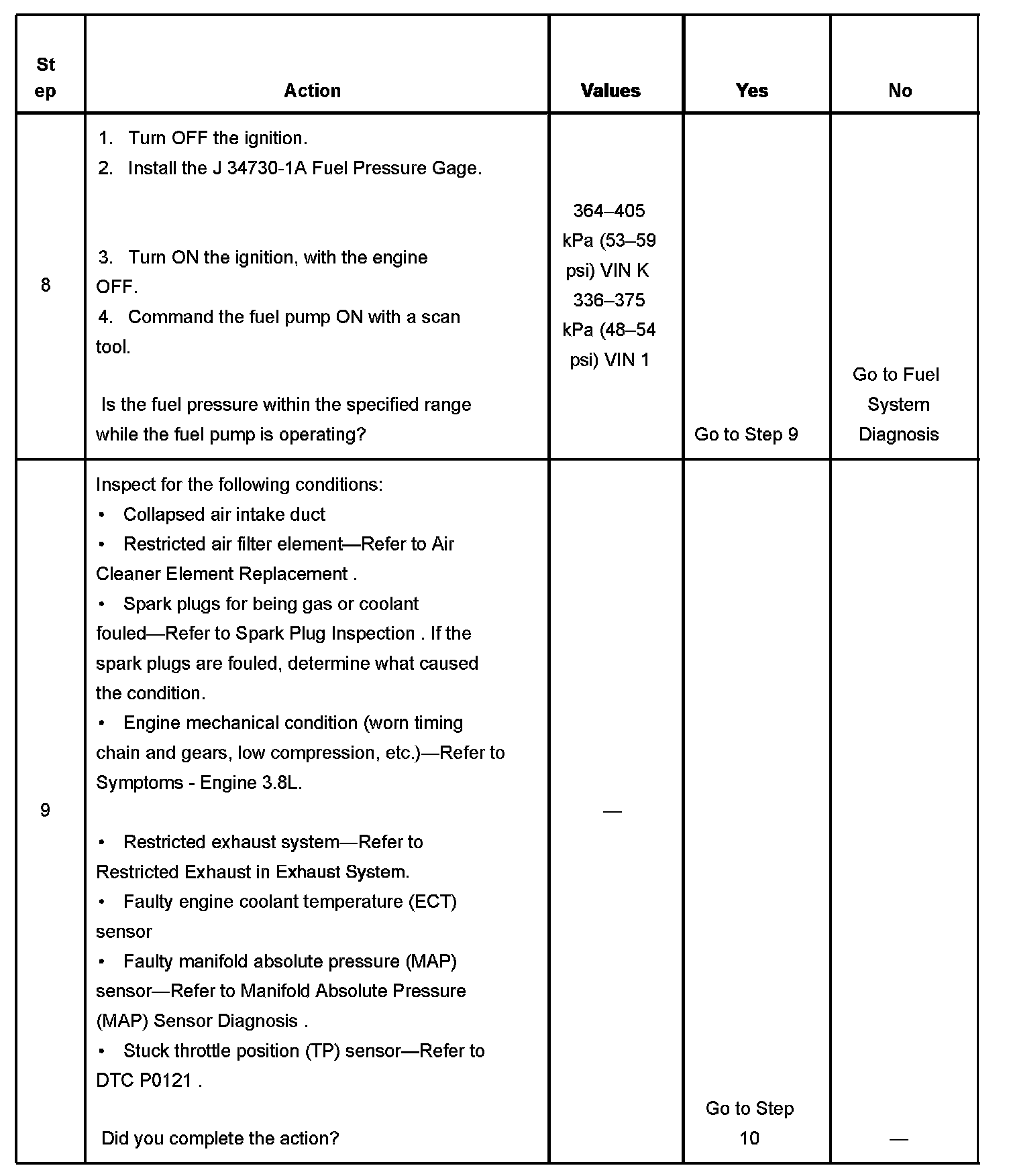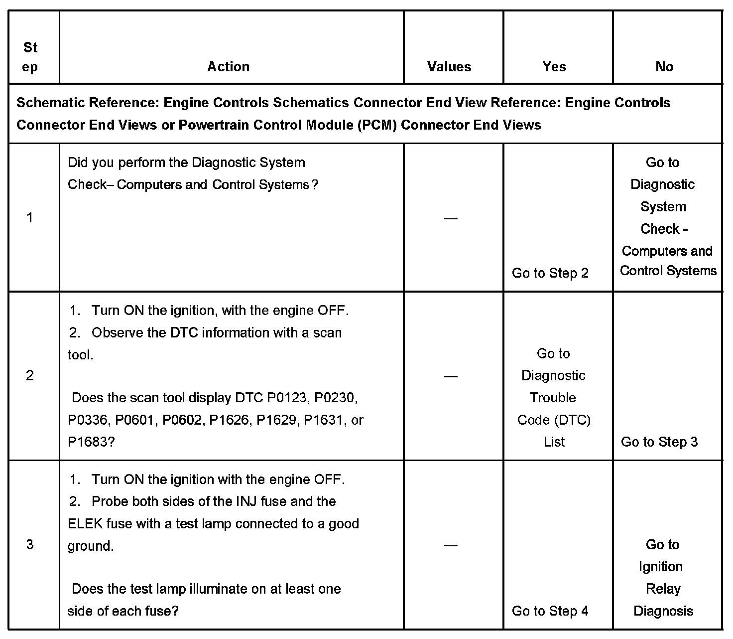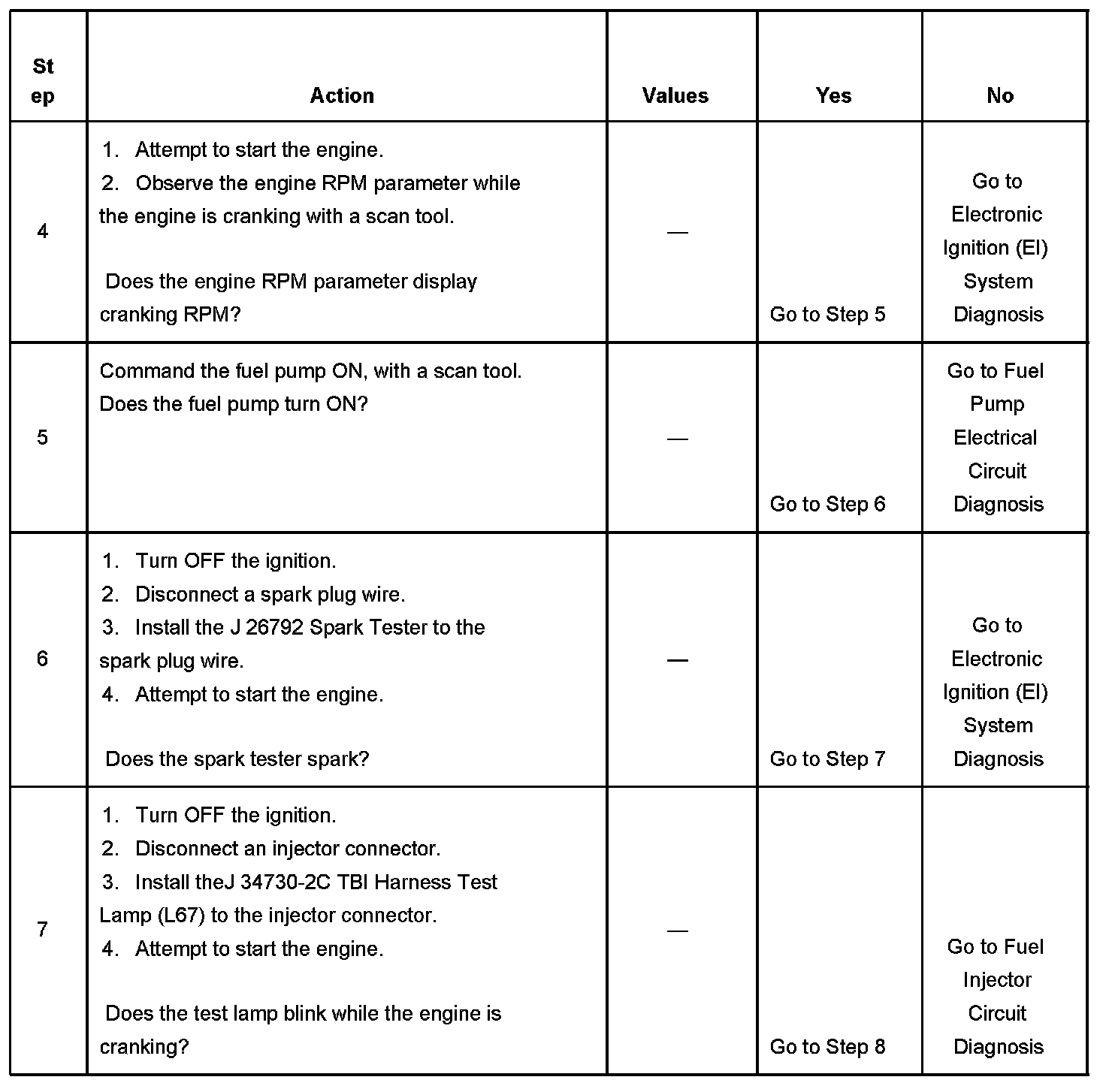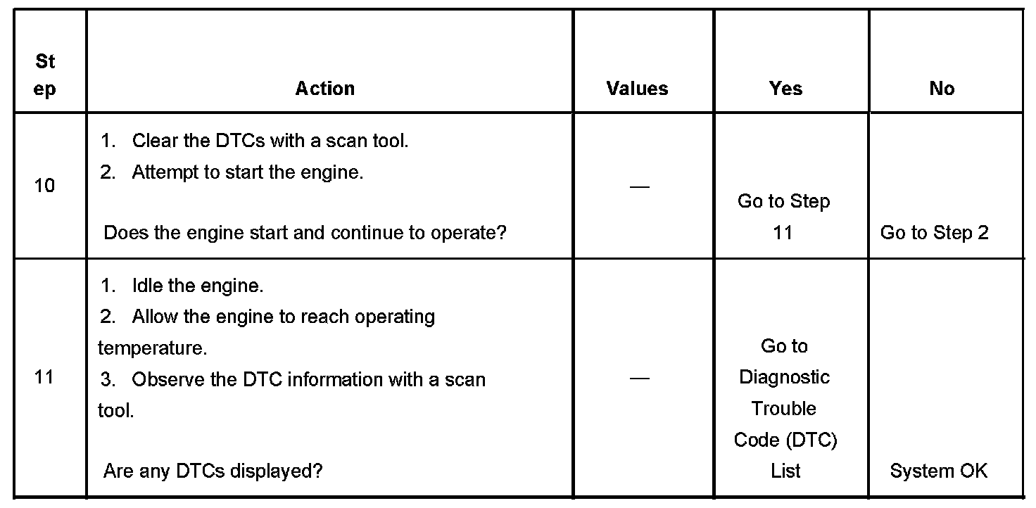 The Engine Cranks but Does Not Run diagnostic table is an organized approach to identifying a condition that causes an engine not to start. The Engine Cranks but Does Not Run diagnostic table directs the service technician to the appropriate system diagnosis. The Engine Cranks but Does Not Run diagnostic table assumes the following: