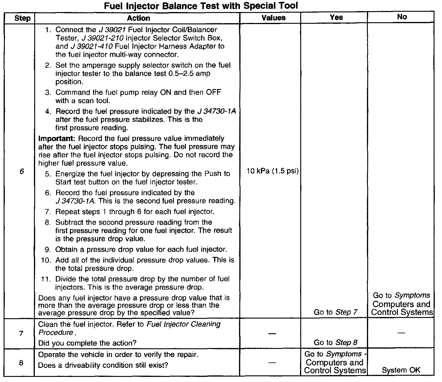6. If the pressure drop value for each fuel injector is within 10 kPa (1.5 psi) of the average pressure drop value, the fuel injectors are flowing properly.