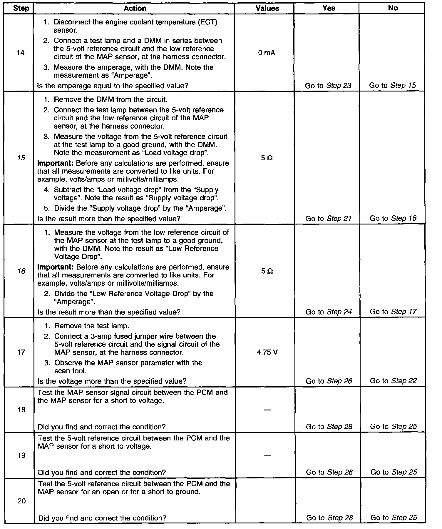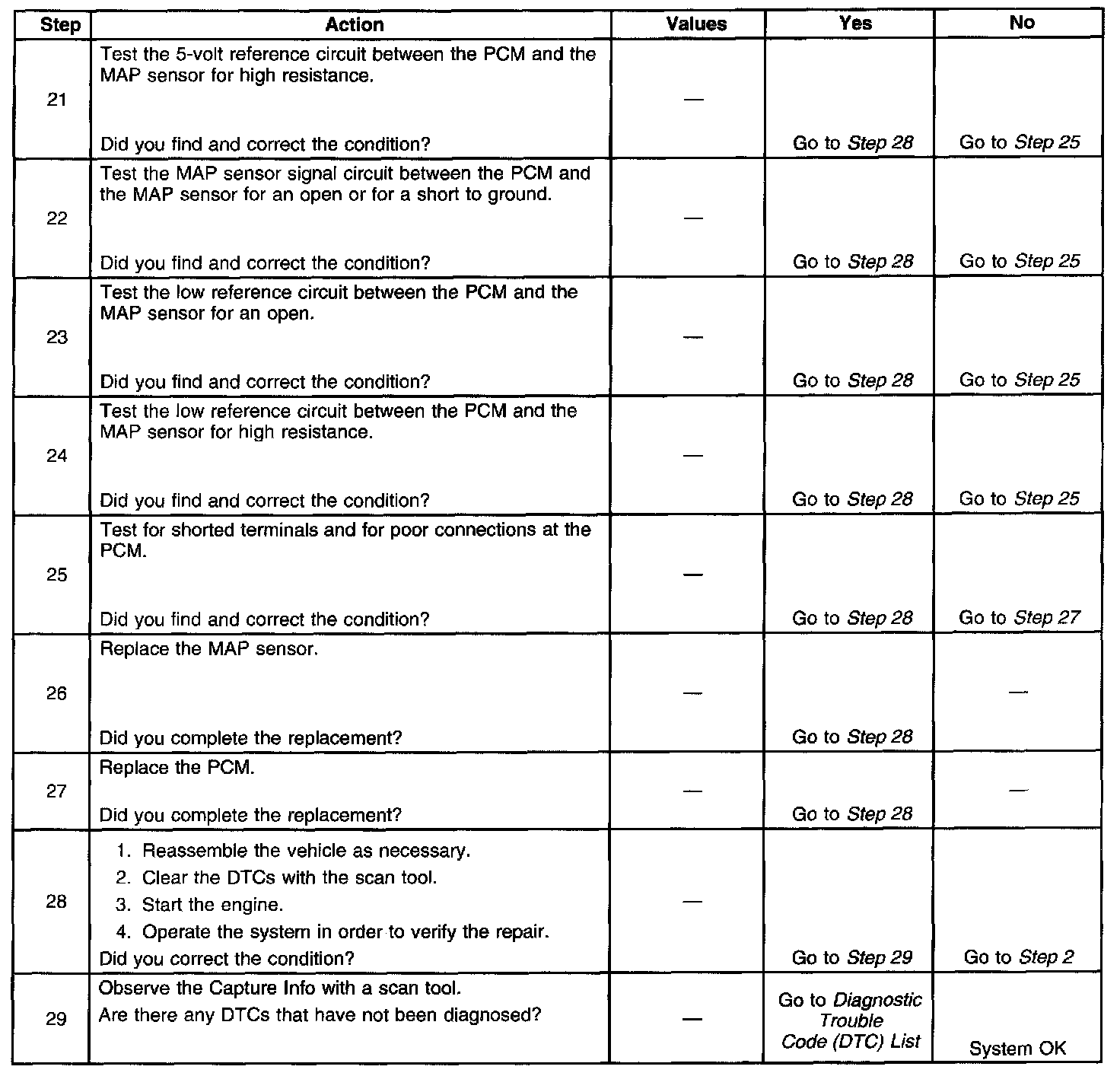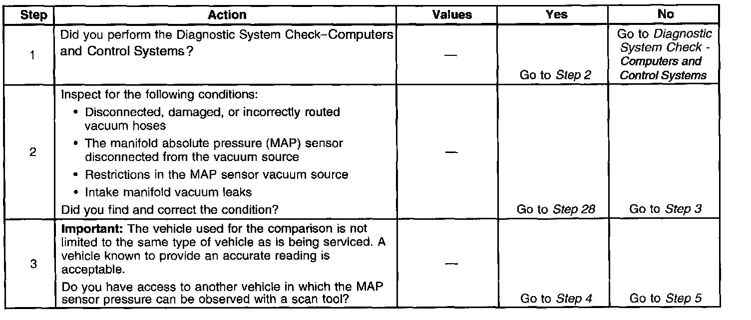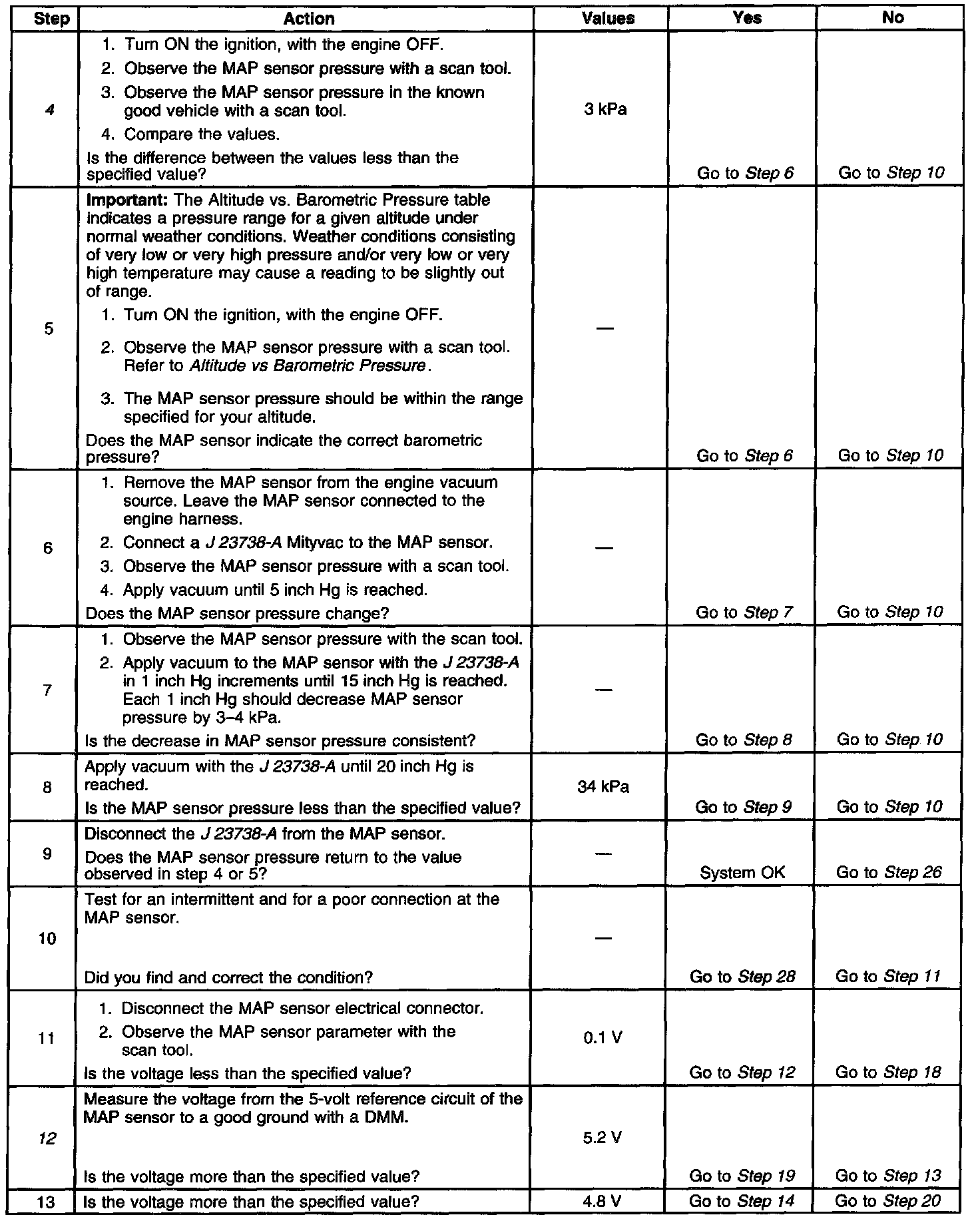The MAP sensor responds to changes in intake manifold pressure which gives an indication of the engine load. The MAP sensor has a 5-volt reference circuit, a low reference circuit, and a signal circuit. The PCM supplies 5 voltsto the MAP sensor on the 5-volt reference circuit and provides a ground on the low reference circuit. The MAP sensor provides a signal to the PCM on the MAP sensor signal circuit, which is relative to the pressure changes in the manifold. With low MAP, such as during idle or deceleration, the PCM should detect a low MAP sensor signal voltage. With high MAP such as WOT, the PCM should detect a high MAP sensor signal voltage. This MAP sensor will indicate pressure between 8-208 kPa. The MAP sensor is also used in order to calculate the BARO when the ignition switch is turned ON, with the engine OFF. The PCM monitors the MAP sensor signal for voltage outside of the normal range. If the PCM detects a MAP sensor signal voltage that is excessively low, DTC P0107 sets. If the PCM detects a MAP sensor signal voltage that is excessively high, DTC P0108 sets.