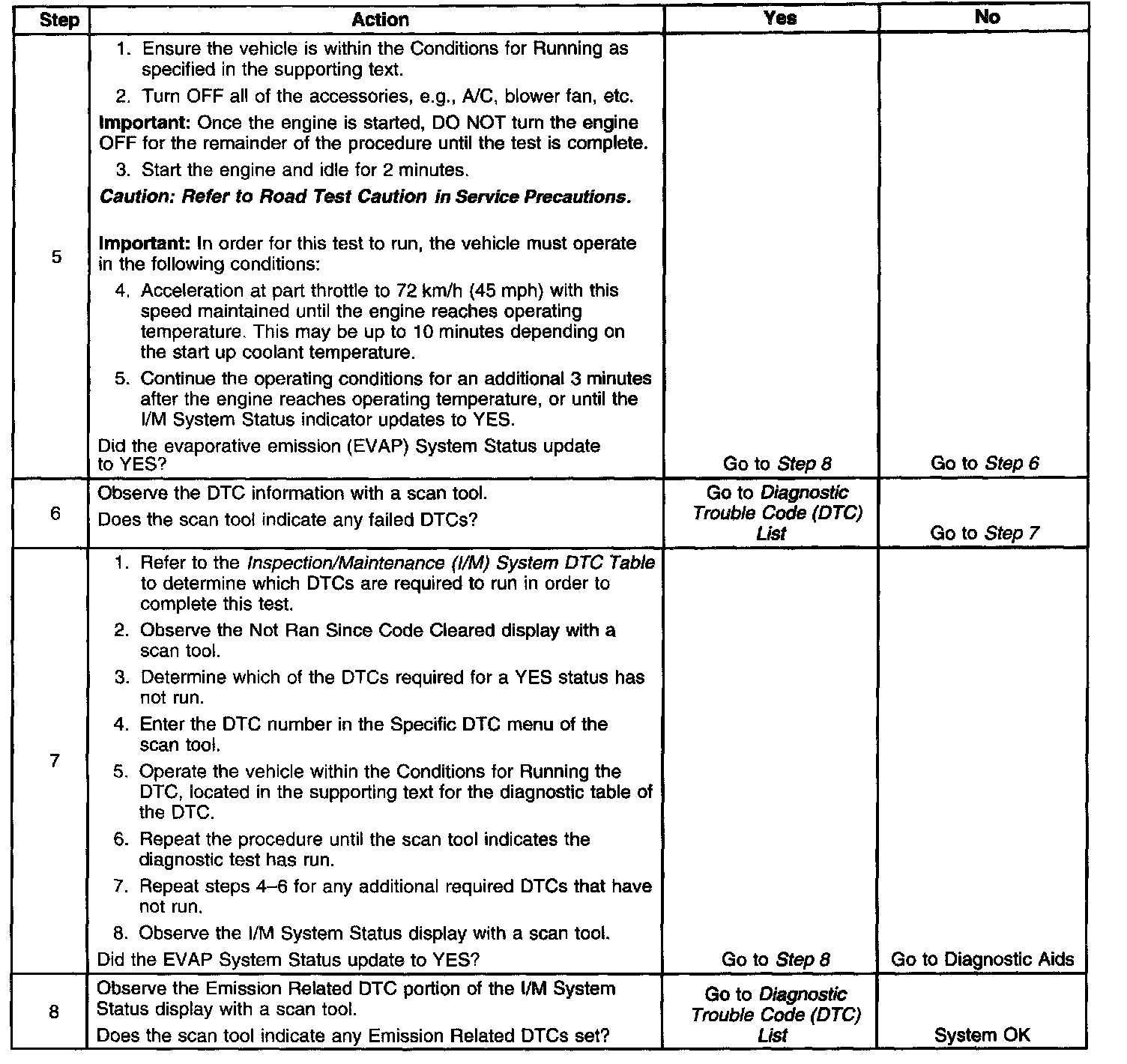 The purpose of this test is to satisfy the enable criteria necessary to execute inspection/maintenance (I/M) readiness diagnostics for the evaporative emission (EVAP) system. The test may be used to set the I/M System Status indicators to YES. The I/M System Status display on the scan tool indicates whether or not the control module has completed the required test. The required test is complete when either all of the DTCs comprising the test have run and passed, or when any one of the DTCs comprising the test has illuminated the malfunction indicator lamp (MIL). Once the test is complete, the I/M System Status display will indicate YES in the completed column. Performing a visual inspection prior to running the EVAP test may prevent having to repeat the test due to the fact that a failed or aborted test will require the vehicle to cool down in order to meet the enable criteria to run another test.