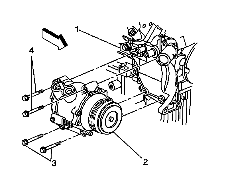 4. Align the bracket with the long bolts before tightening the compressor (2) to the bracket (1).
