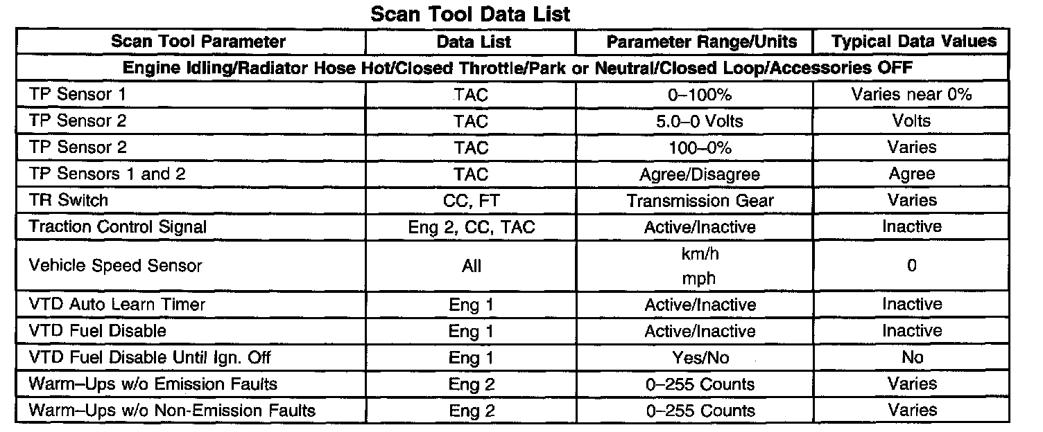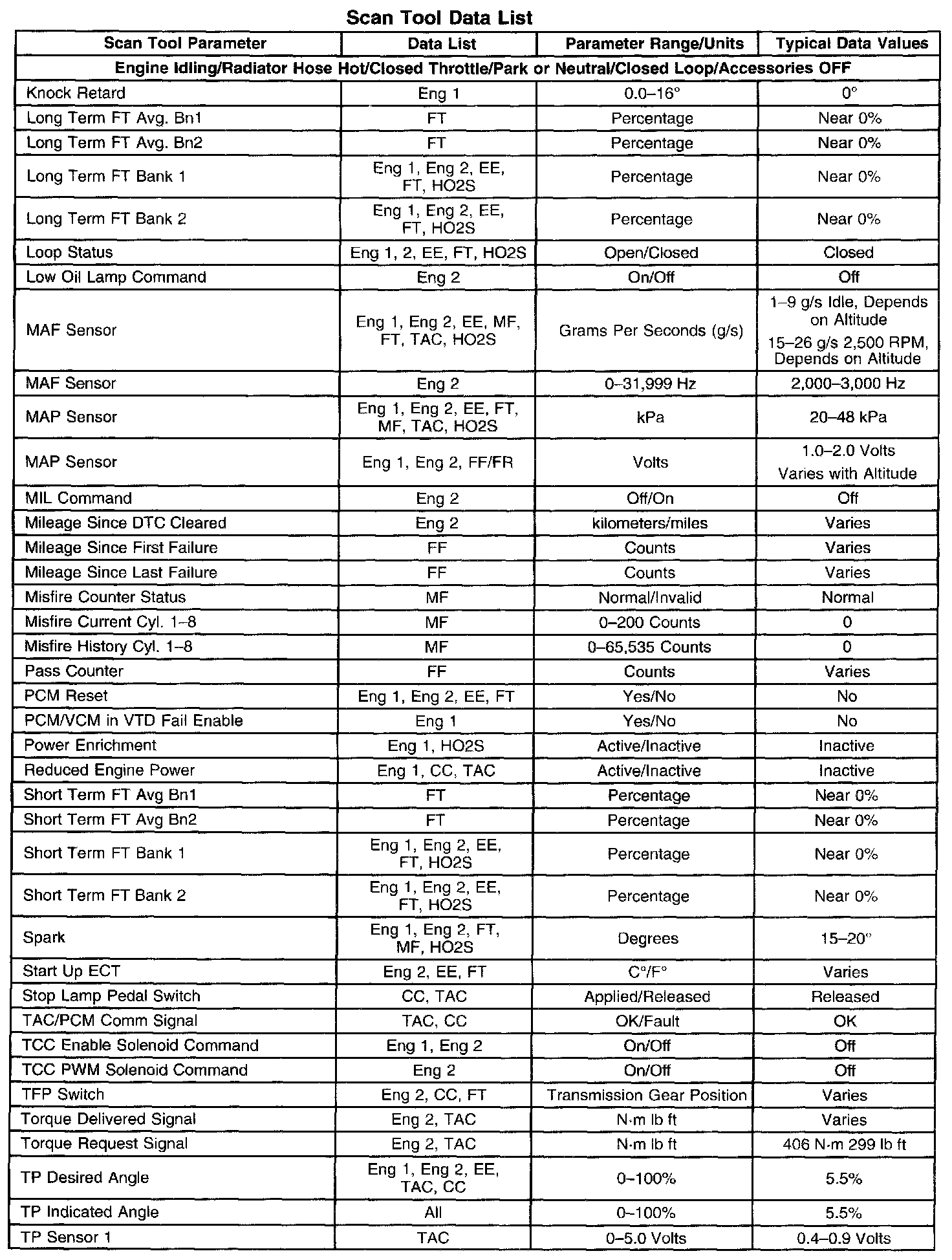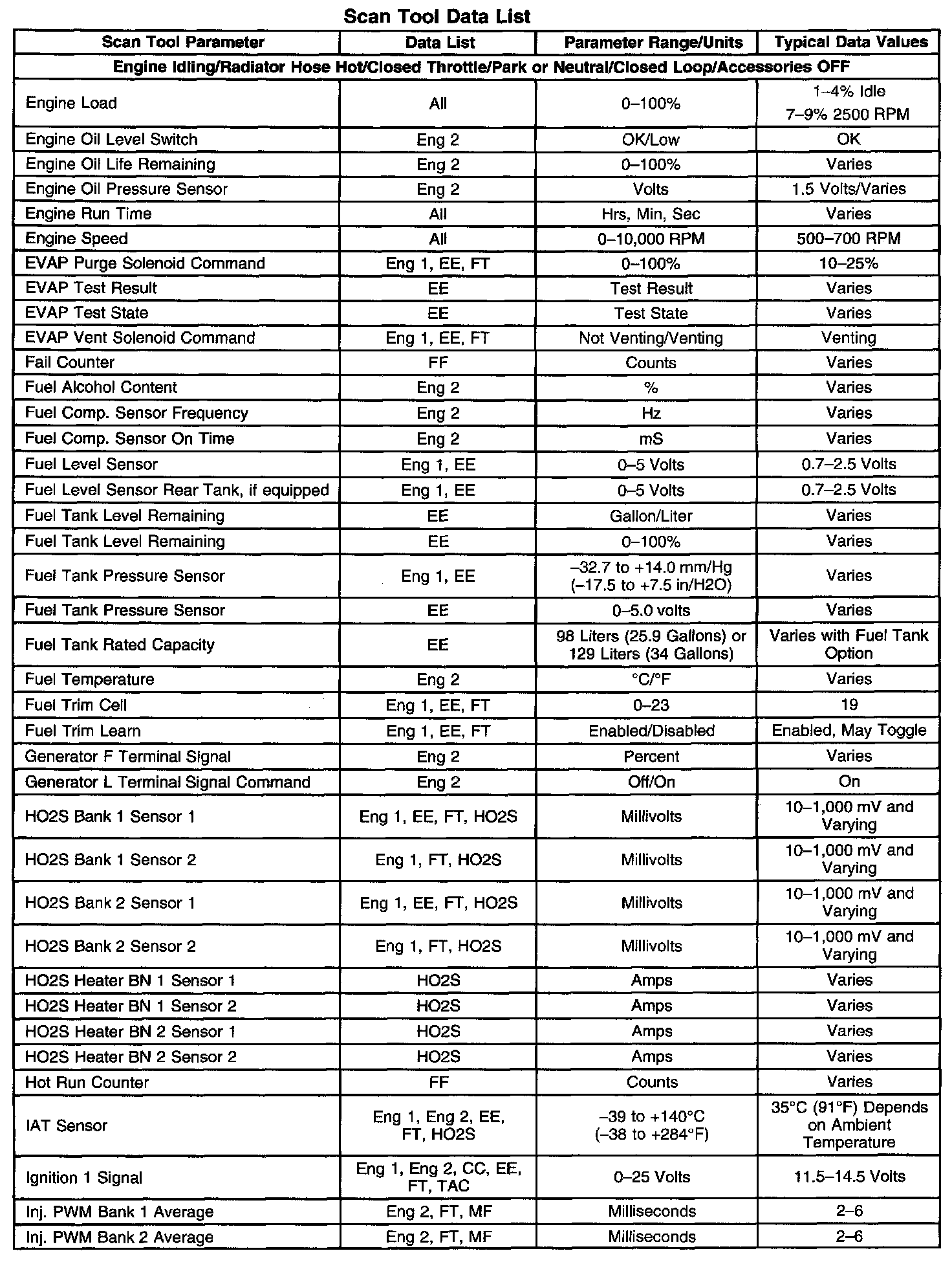 The Engine Scan Tool Data List contains all engine related parameters that are available on the scan tool. The list is arranged in alphabetical order. A given parameter may appear in any one of the data lists, and in some cases may appear more than once, or in more than one data list in order to group certain related parameters together.