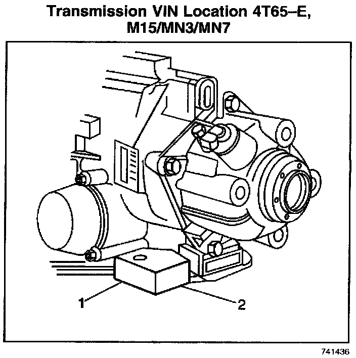 The primary (1) and secondary (2) Manual Tooling VIN Derivative Locations are on the casting of the transmission housing.