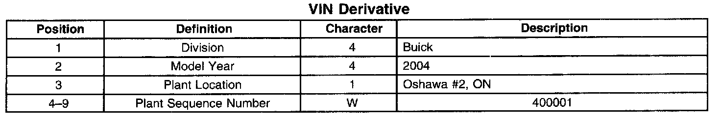 All engines and transmissions are stamped with a partial Vehicle Identification Number (VIN). The table identifies the different VIN derivative characters, character positions and their respective positions.