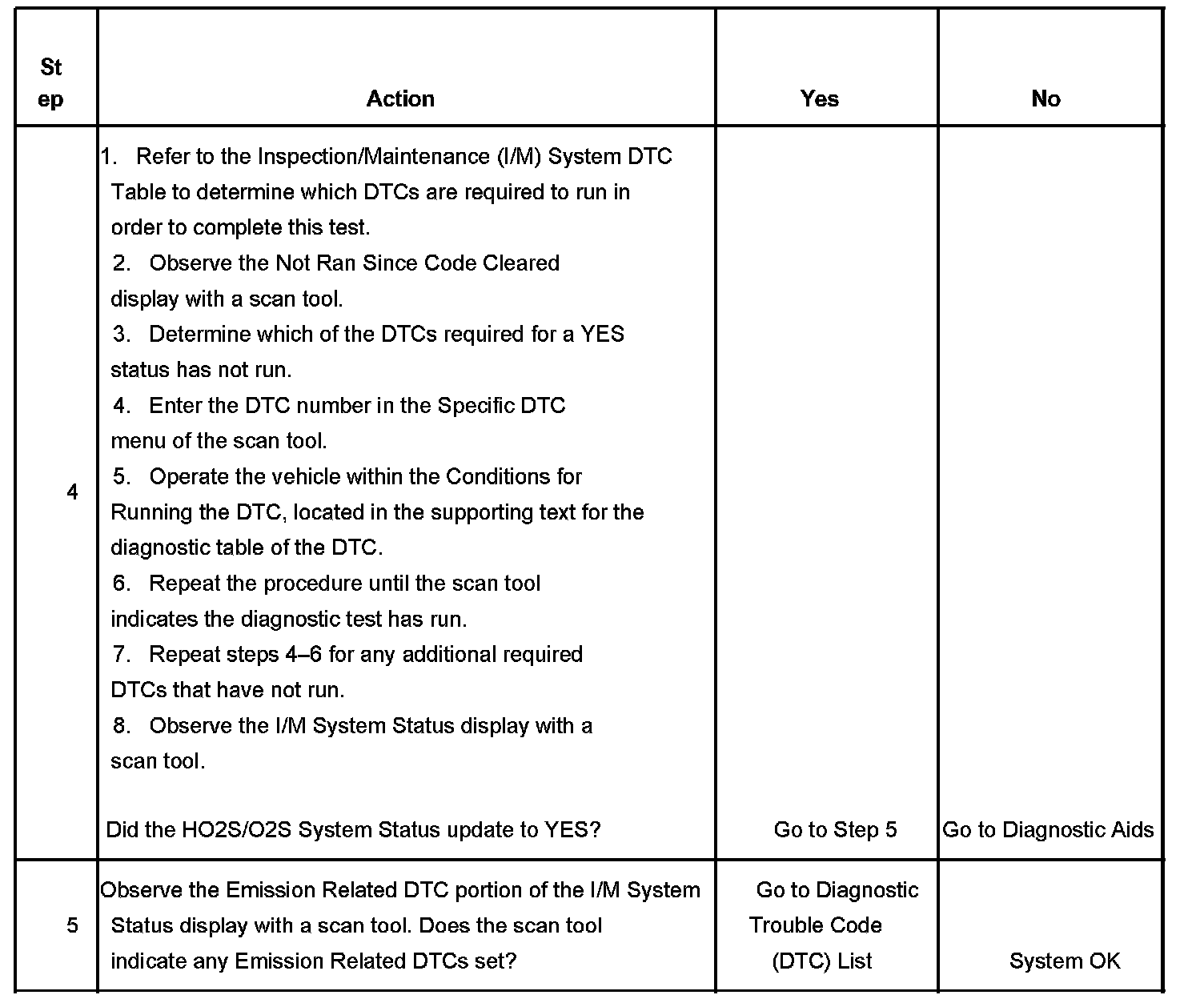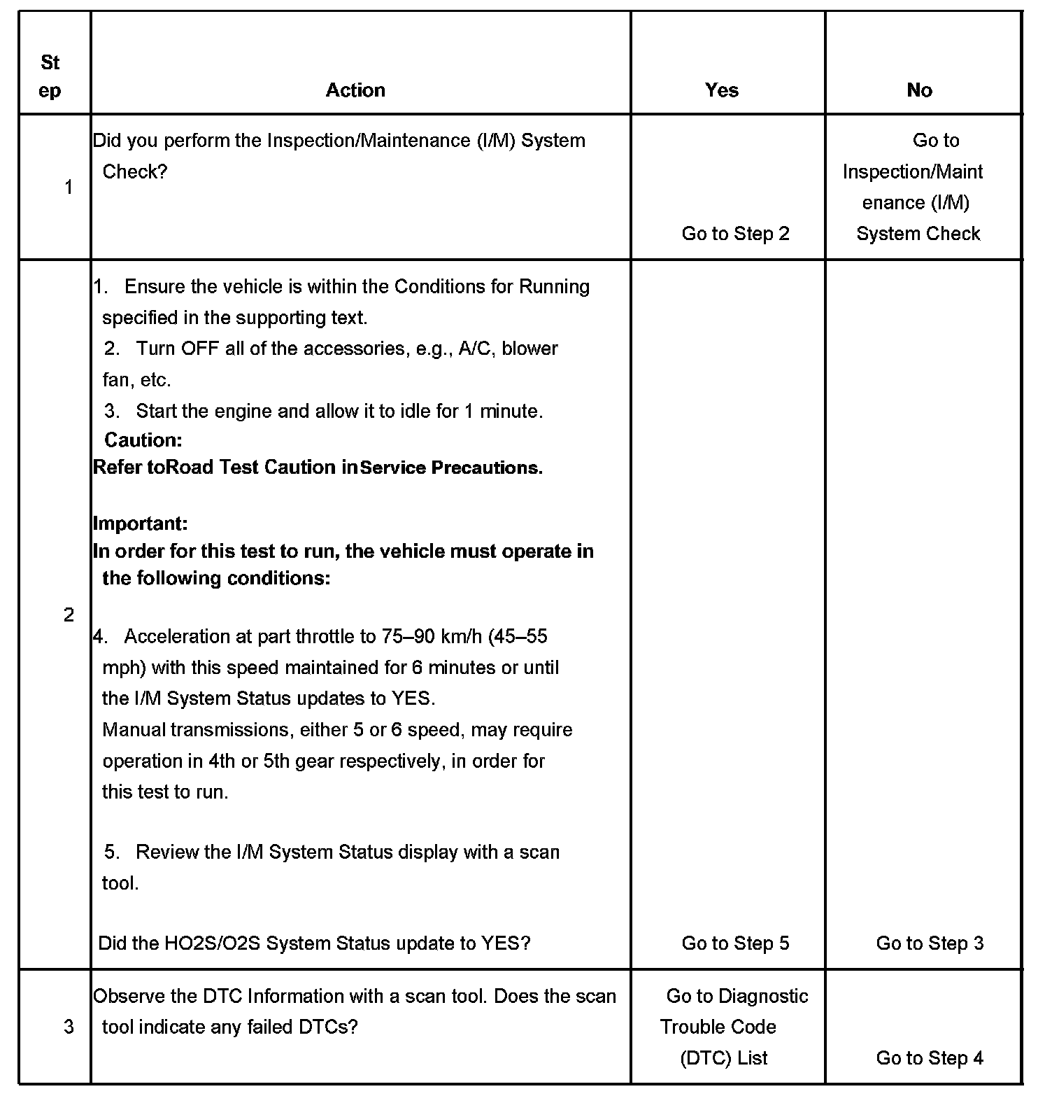 The purpose of this test is to satisfy the enable criteria necessary to execute I/M readiness diagnostics for the oxygen sensor (O2S, HO2S) system. The test may be used to set the I/M System Status to YES. The I/M System Status display on the scan tool provides an indication of whether the control module has completed the required tests. The I/M System Status does not indicate that the tests have passed or failed. When all of the diagnostics for a specific system have run and passed, the I/M System Status will update to YES. If a test for a specific system has failed, the I/M System Status will update to YES, indicating a determination was made, even if all of the other tests for that system have not run.
