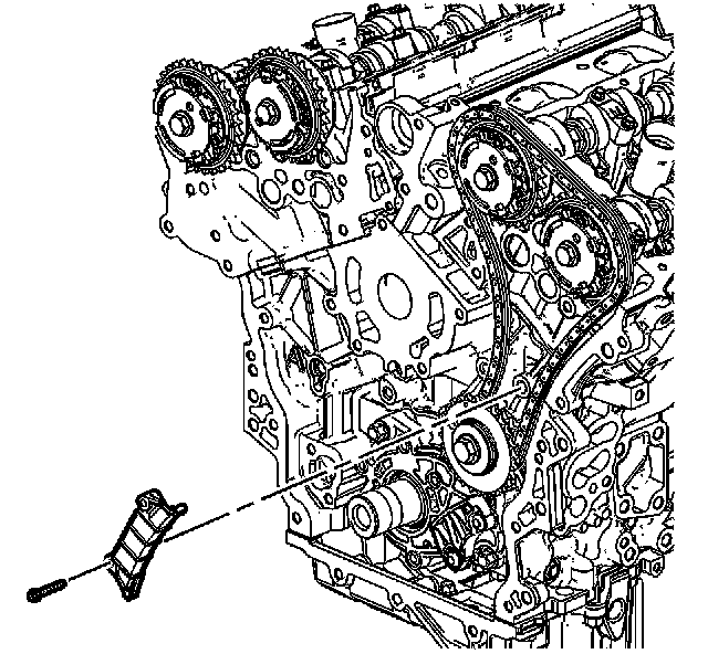 2. Install the left bank secondary camshaft drive chain tensioner. 118. Secondary Timing Chain Tensioner Installation - Left