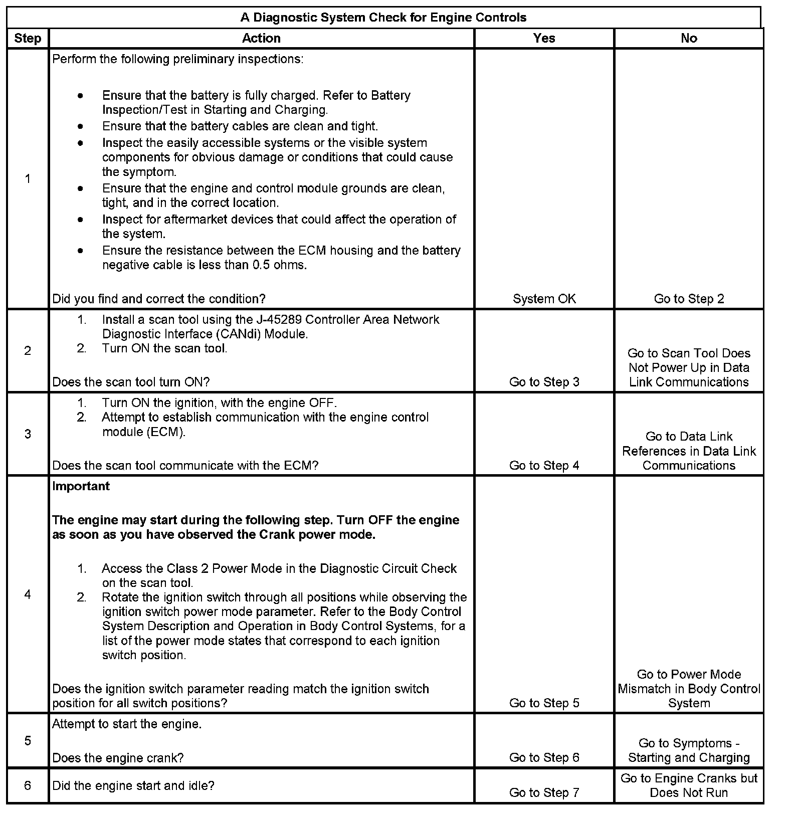 The Diagnostic System Check - Computers and Control Systems is an organized approach to identifying a condition that is created by a malfunction in the engine control system. The Diagnostic System Check must be the starting point for any driveability concern. The Diagnostic System Check directs the service technician to the next logical step in order to diagnose the concern. Understanding and correctly using the diagnostic table reduces diagnostic time and prevents the replacement of good parts.