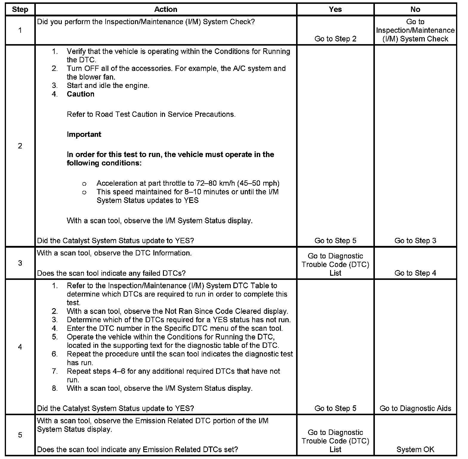 5. The I/M System Status only reports on whether or not a diagnostic has run, not what the outcome of the test was. If any emission related DTC sets after the tests are complete, the DTC will require diagnosis.