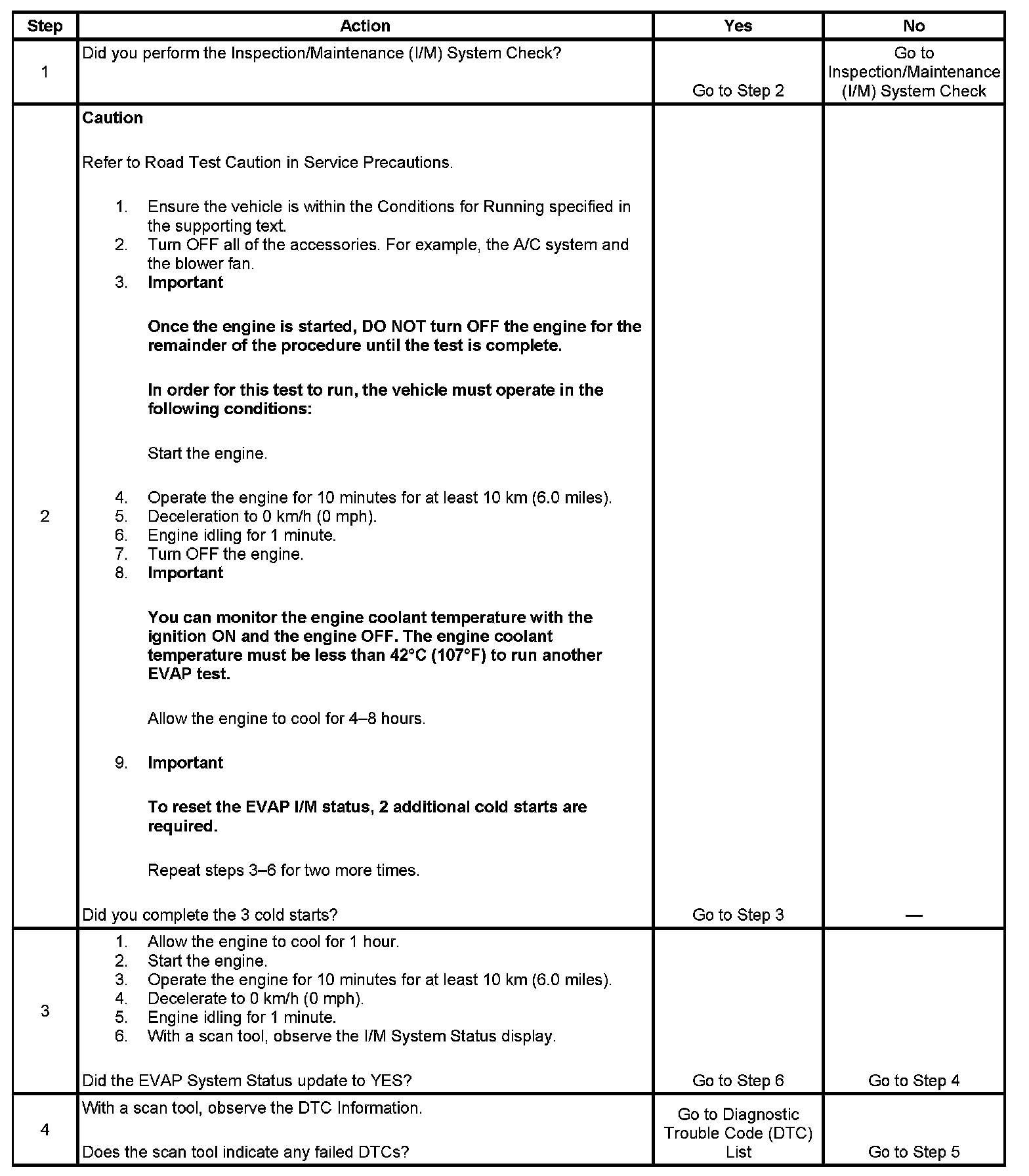 The purpose of this test is to satisfy the enable criteria necessary to execute I/M readiness diagnostics for the evaporative emission (EVAP) system. The test may be used to set the I/M System Status indicators to YES. Ensure the vehicle meets the requirements listed in Conditions for Running before performing the EVAP System Test. Failure to meet the necessary requirements may produce inaccurate test results.