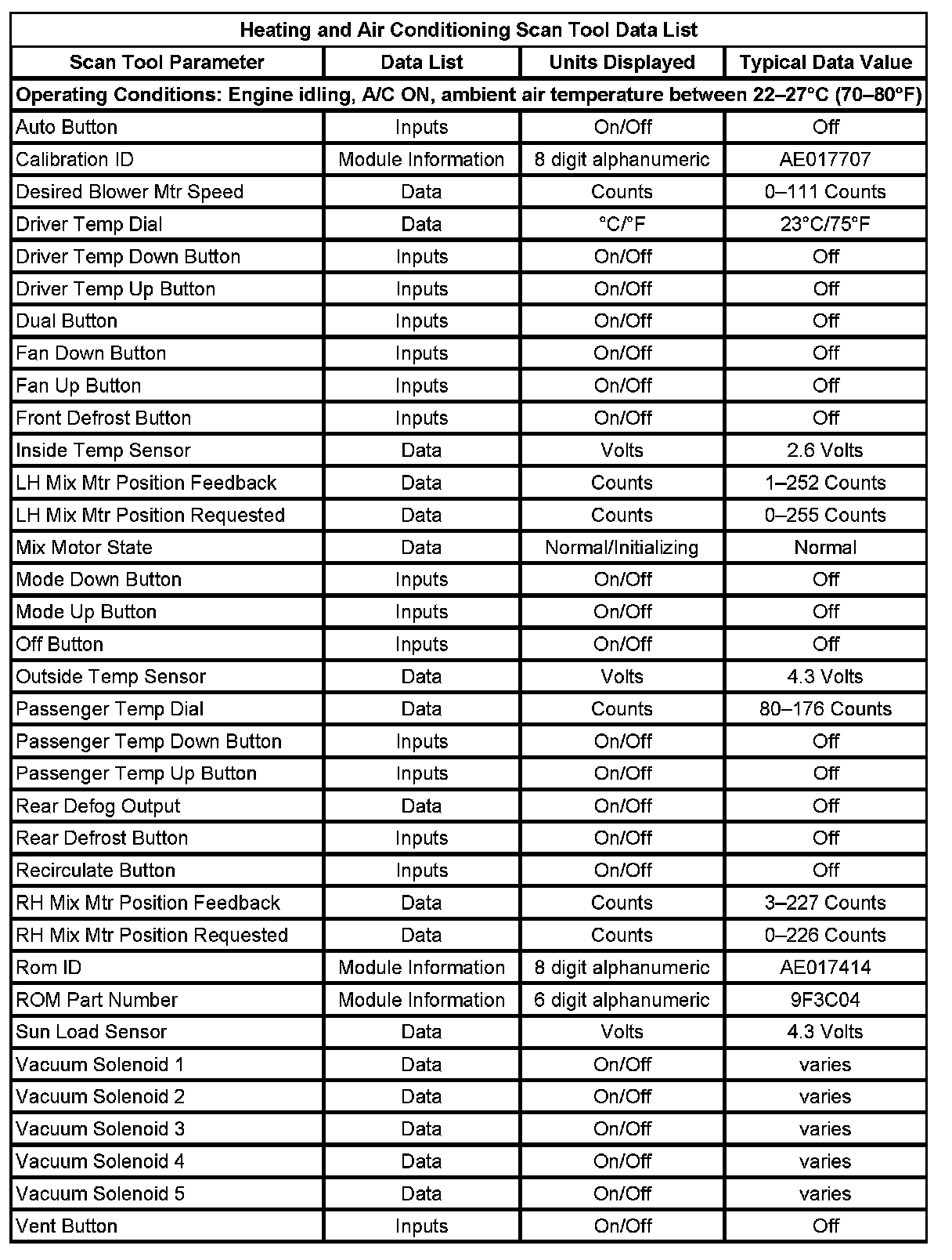 Use the Scan Tool Data Display Values and Definitions Information in order to assist in diagnosing the HVAC Control Module problems. Compare the vehicles actual scan tool data with the typical data display value table information. Use the data information in order to aid in understanding the nature of the problem when the vehicle does not match with the typical data display values.
