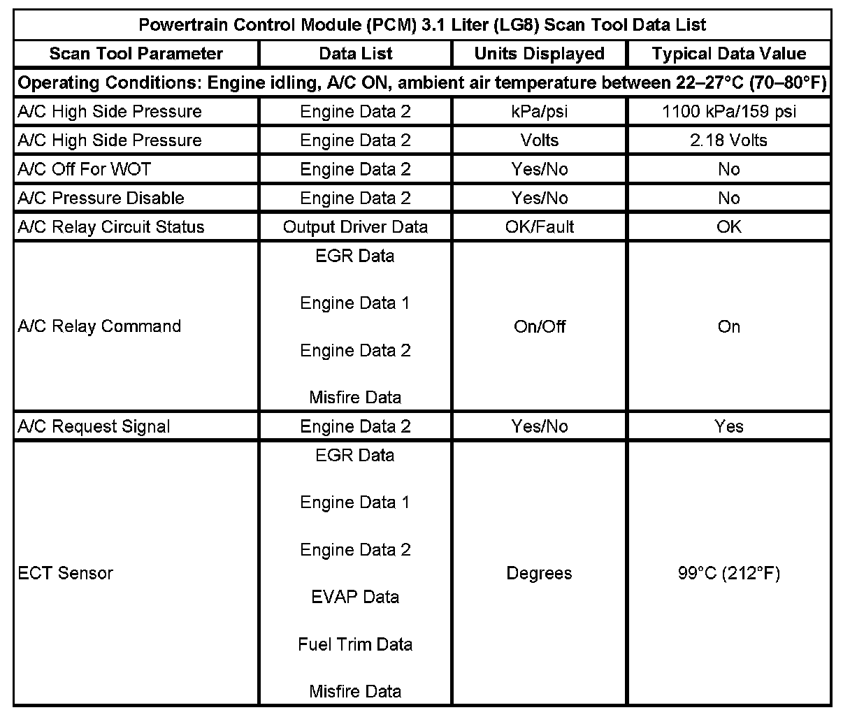 Powertrain Control Module (PCM) Scan Tool Data List: