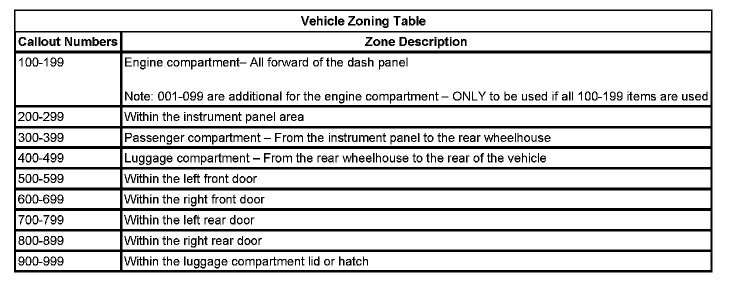 All grounds, in-line connectors, pass-through grommets, and splices have identifying numbers that correspond to where they are located in the vehicle. The table explains the numbering system.