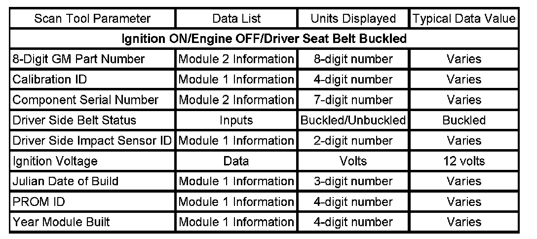 Use the SIR scan tool data list as directed by a diagnostic table or in order to supplement the diagnostic procedures. Begin all of the diagnostic procedures with a diagnostic system check - Restraint Systems. Use the SIR scan tool data list after the following is determined: