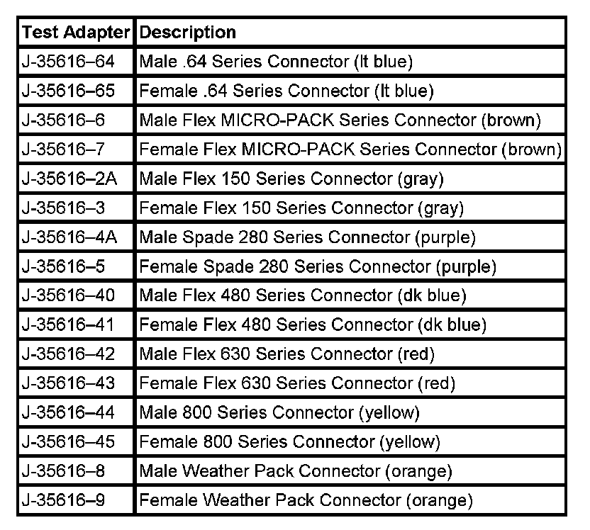 NOTE Do not insert test equipment probes (DVOM etc.) into any connector or fuse block terminal. The diameter of the test probes will deform most terminals. A deformed terminal will cause a poor connection, which will result in a system failure. Always use the J-35616 GM-Approved Terminal Test Kit or the J 42675 Flat-Wire Probe Adapter in order to front probe terminals. Do not use paper clips or other substitutes to probe terminals.
