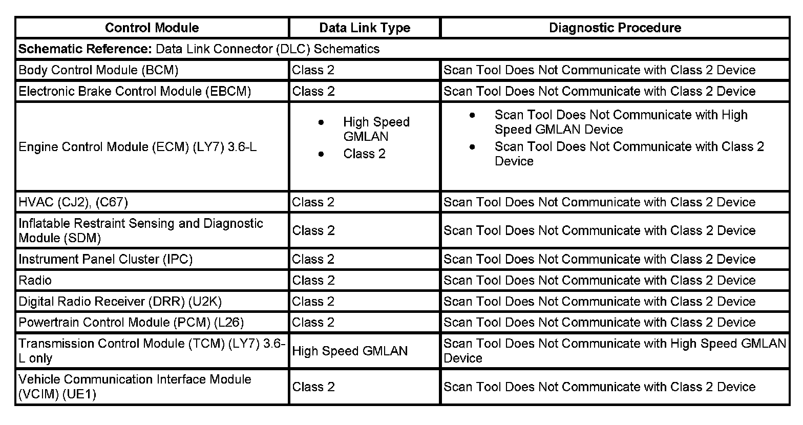 This table identifies which serial data link that a particular module uses for in-vehicle data transmission. Some modules may use more than one data link to communicate. Some modules may have multiple communication circuits passing through them without actively communicating on that data link. This table is used to assist in correcting a communication malfunction. For the description and operation of these serial data communication circuits refer to Data Link Communications Description and Operation.