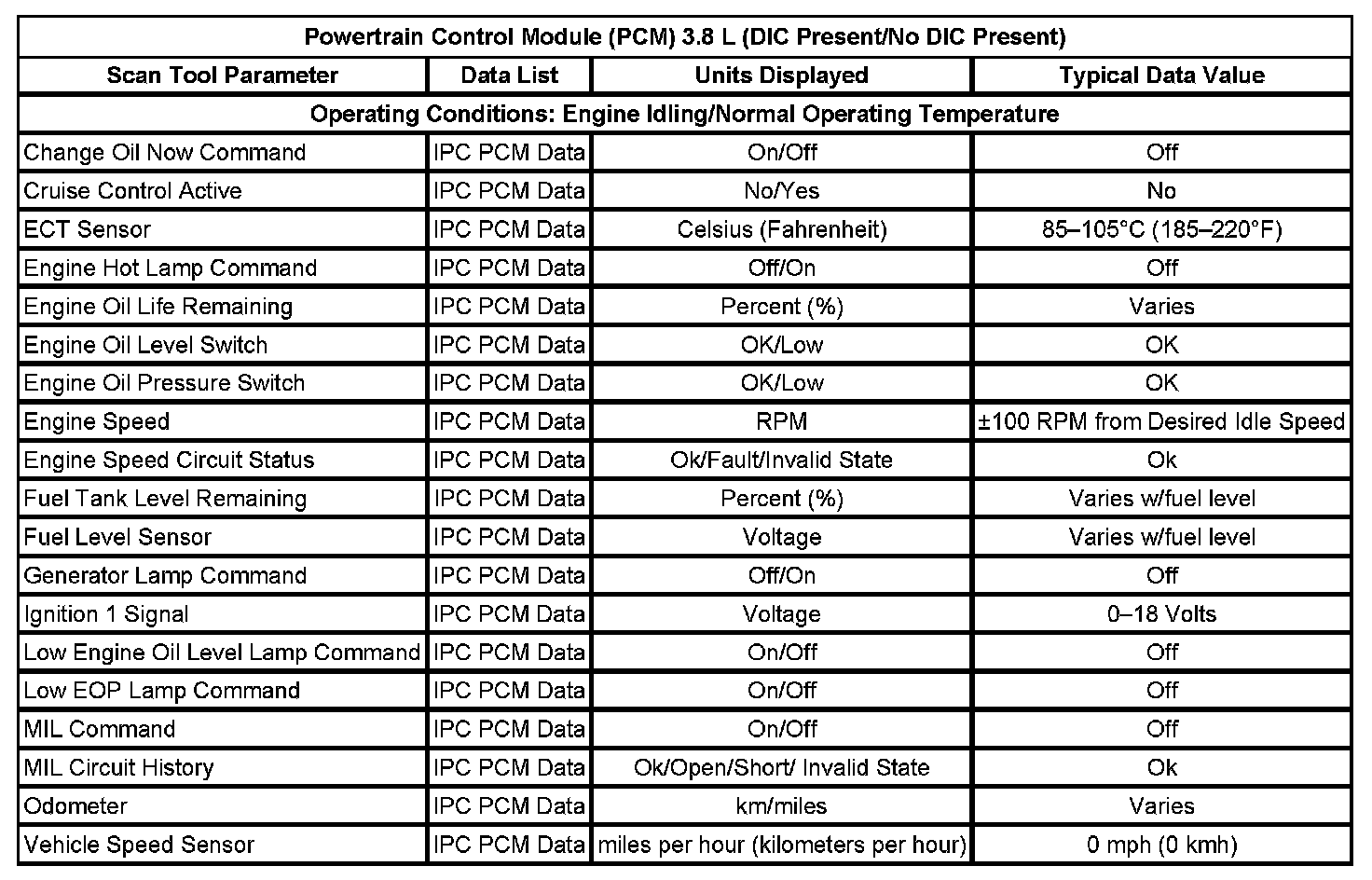 Scan Tool Data List - Powertrain Control Module (PCM)