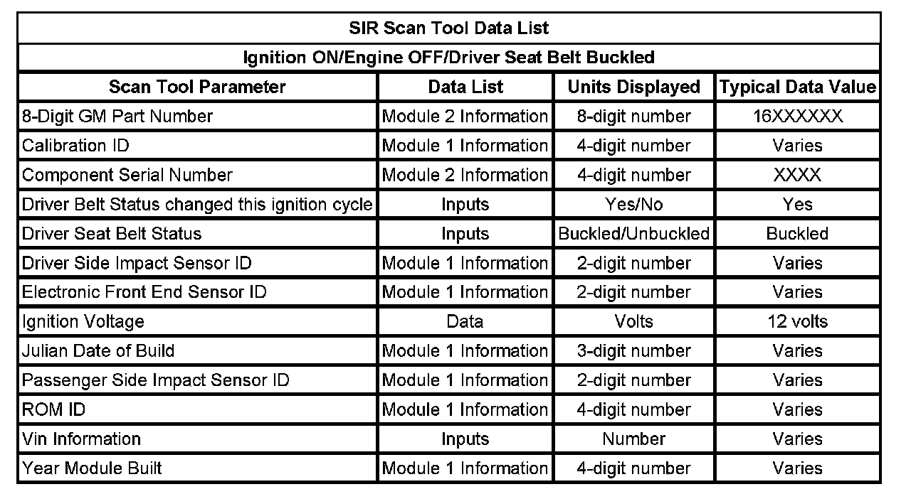The SIR scan tool data list contains all the restraint system related parameters that are available on the scan tool. The parameters in the list are arranged in alphabetical order. The column, "Data List," indicates the location of the parameter within the scan tool menu selections.