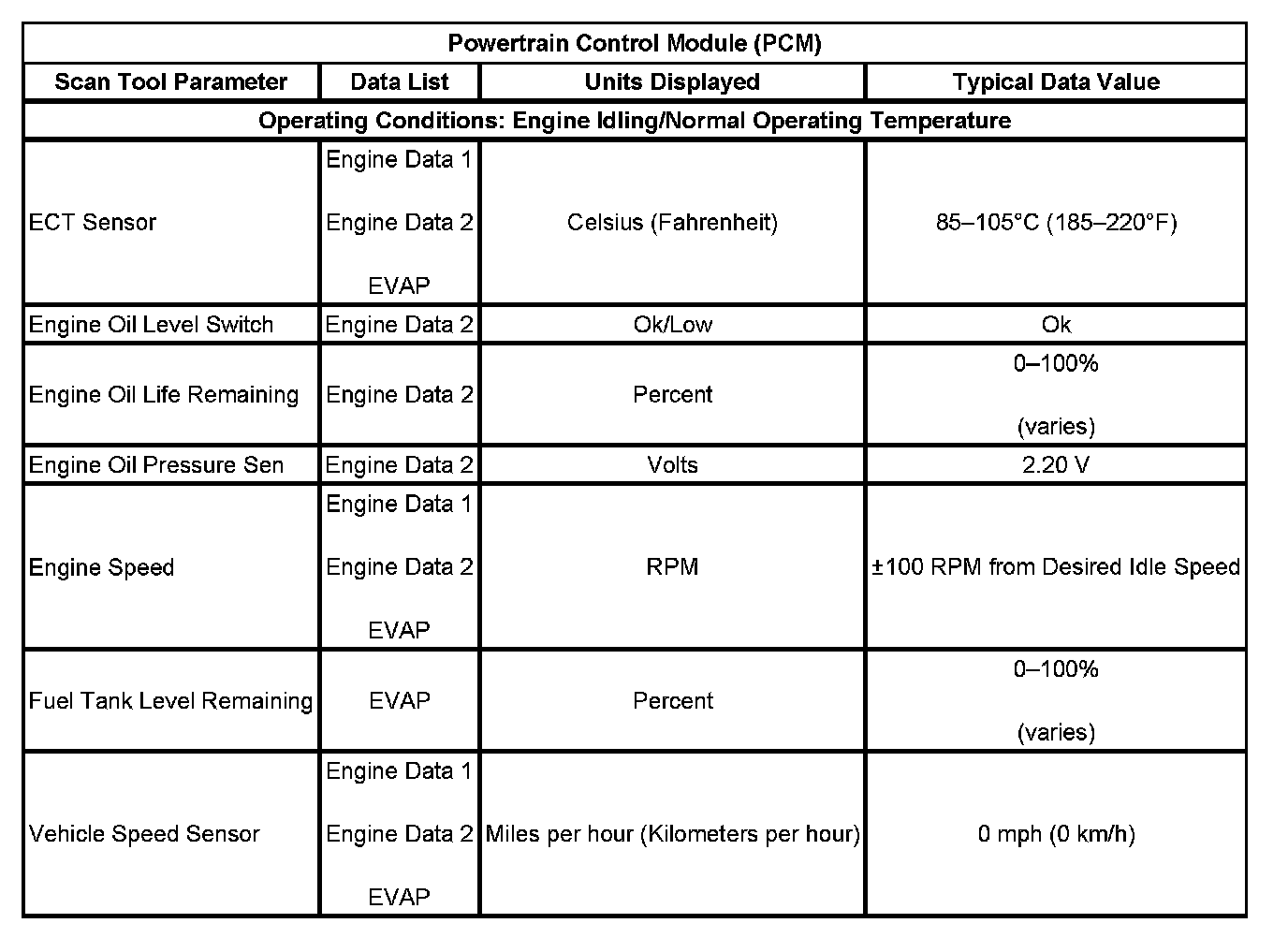 Scan Tool Data List - Powertrain Control Module (PCM)