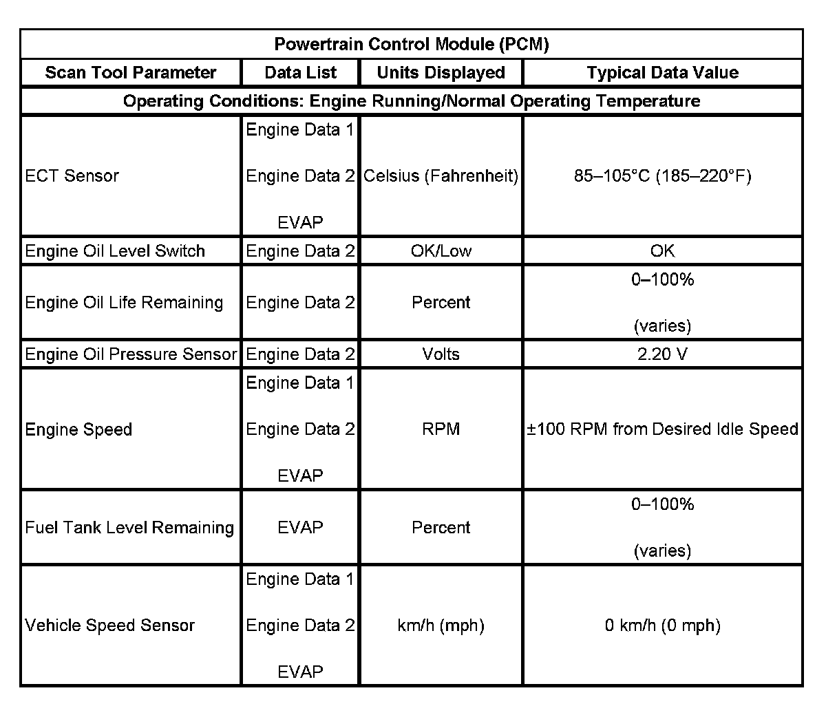 Scan Tool Data List - Powertrain Control Module (PCM)