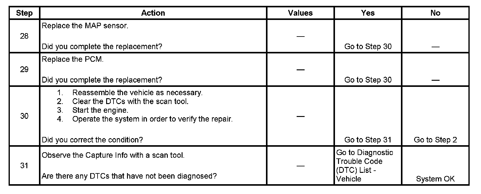 The MAP sensor responds to changes in intake manifold pressure which gives an indication of the engine load. The MAP sensor has a 5-volt reference circuit, a low reference circuit, and a signal circuit. The PCM supplies 5 volts to the MAP sensor on the 5-volt reference circuit and provides a ground on the low reference circuit. The MAP sensor provides a signal to the PCM on the MAP sensor signal circuit, which is relative to the pressure changes in the manifold. With low MAP, such as during idle or deceleration, the PCM should detect a low MAP sensor signal voltage. With high MAP, such as WOT, the PCM should detect a high MAP sensor signal voltage. This MAP sensor will indicate pressure between 8-208 kPa. The MAP sensor is also used in order to calculate the BARO when the ignition switch is turned ON, with the engine OFF. The PCM monitors the MAP sensor signal for voltage outside of the normal range. If the PCM detects a MAP sensor signal voltage that is excessively low, DTC P0107 sets. If the PCM detects a MAP sensor signal voltage that is excessively high, DTC P0108 sets.