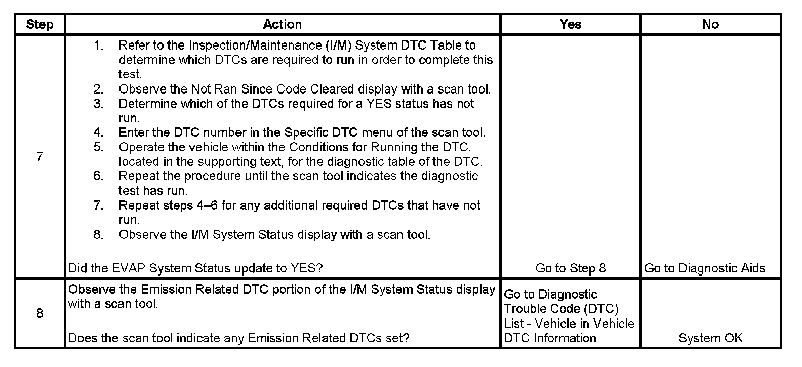 The purpose of this test is to satisfy the enable criteria necessary to execute inspection/maintenance (I/M) readiness diagnostics for the evaporative emission (EVAP) system. The test may be used to set the I/M System Status indicators to YES. The I/M System Status display on the scan tool indicates whether or not the control module has completed the required test. The required test is complete when either all of the DTCs comprising the test have run and passed, or when any one of the DTCs comprising the test has illuminated the malfunction indicator lamp (MIL). Once the test is complete, the I/M System Status display will indicate YES in the completed column. Performing a visual inspection prior to running the EVAP test may prevent having to repeat the test due to the fact that a failed or aborted test will require the vehicle to cool down in order to meet the enable criteria to run another test.