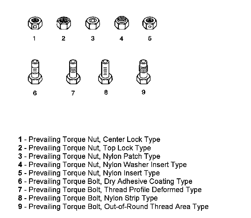 These fasteners accomplish the thread interface by the presence of a thread-locking compound on the fastener threads. Refer to the appropriate repair procedure in order to determine if the fastener may be reused and the applicable thread-locking compound to apply to the fastener.