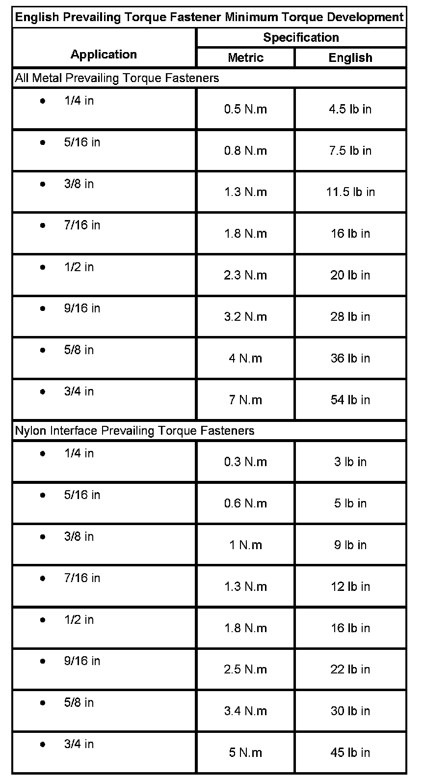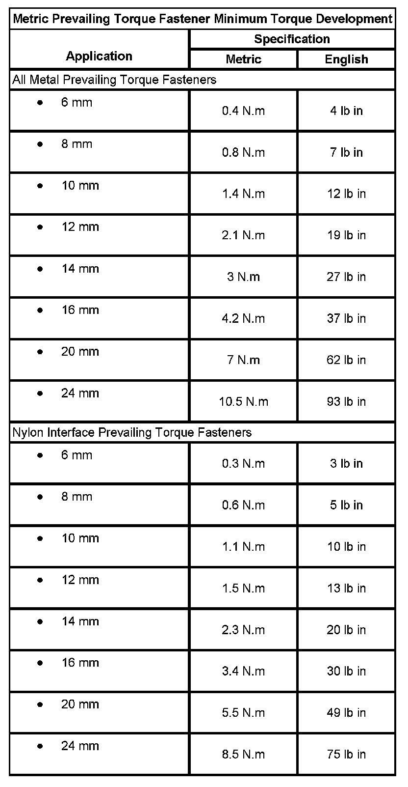 Metric Prevailing Torque Fastener Minimum Torque Development: