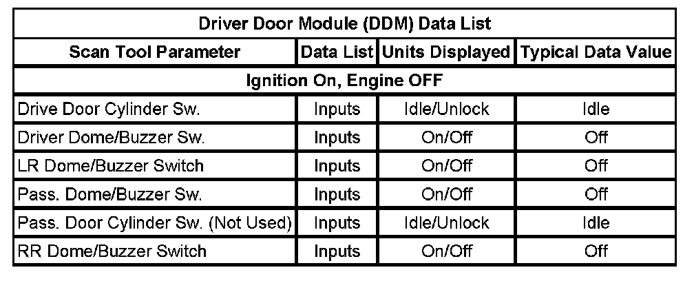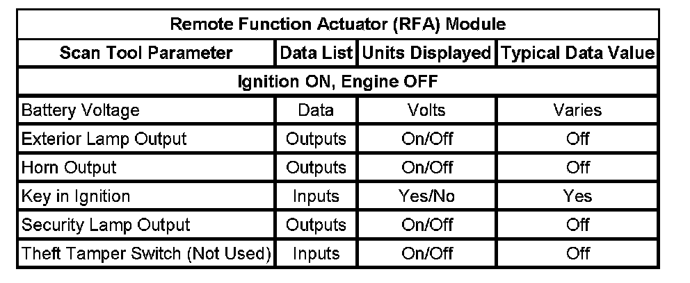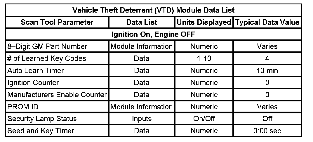 Vehicle Theft Deterrent (VTD) Module Data List: