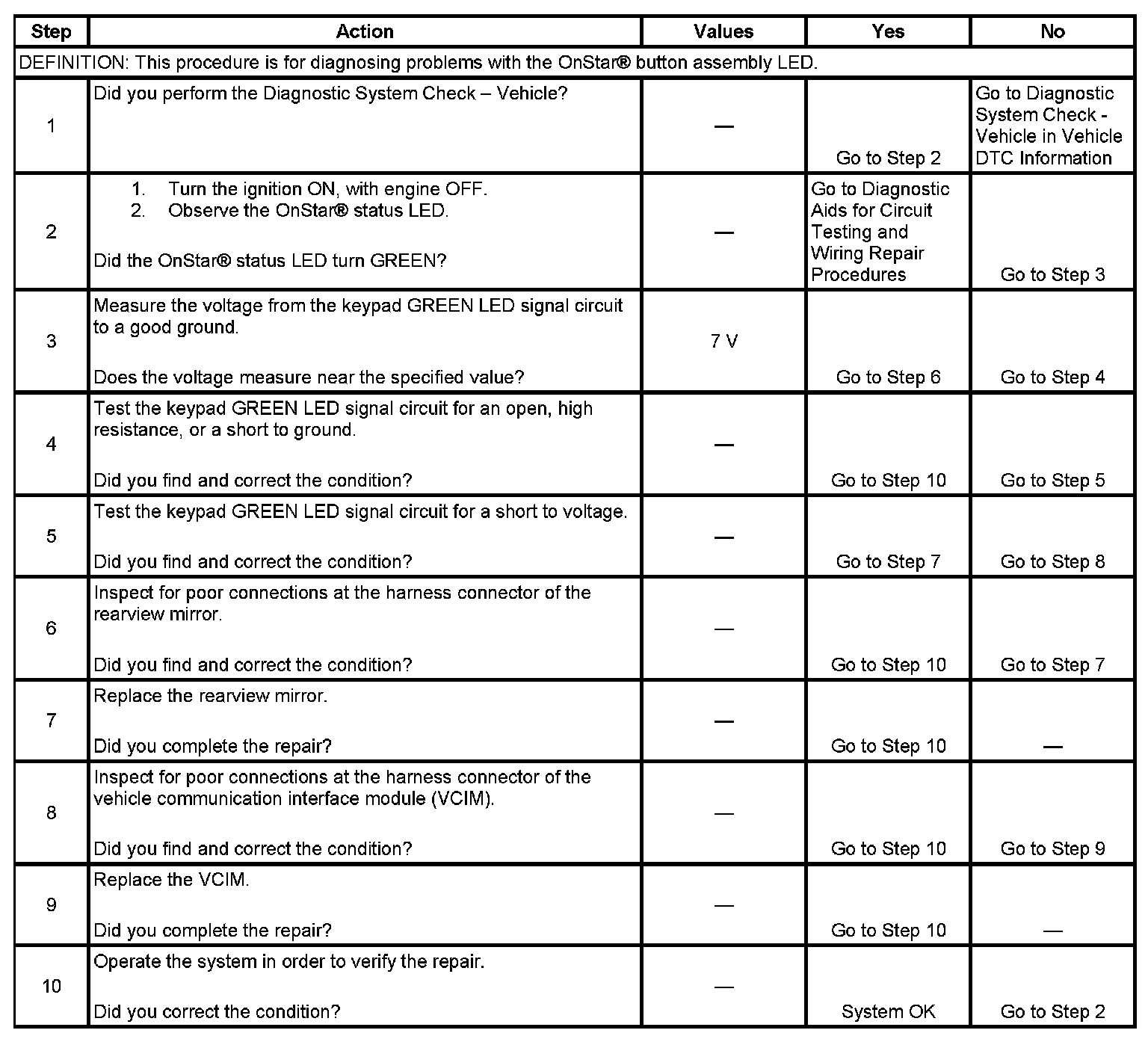 5. If the GREEN LED signal is shorted to voltage, then the OnStar(R) 3-button assembly has been damaged and must be replaced.