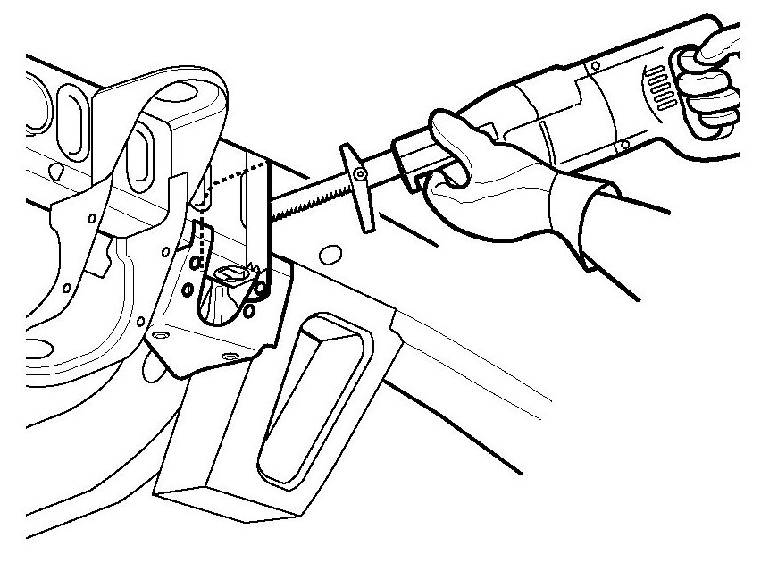 4. Cut each frame rail at the rear edge of the tape line and through the sway bar bracket using a reciprocating saw or equivalent tool, as shown.