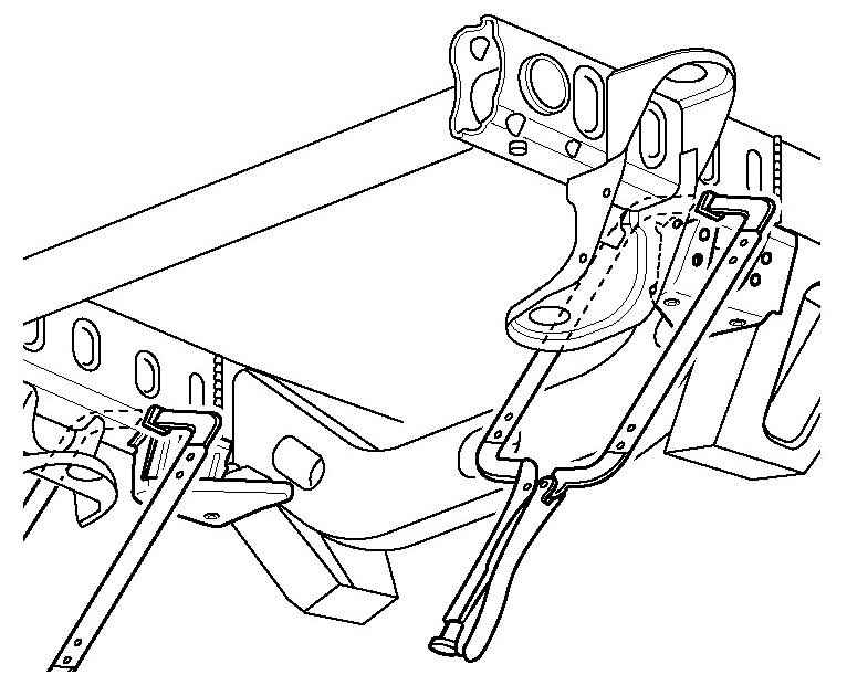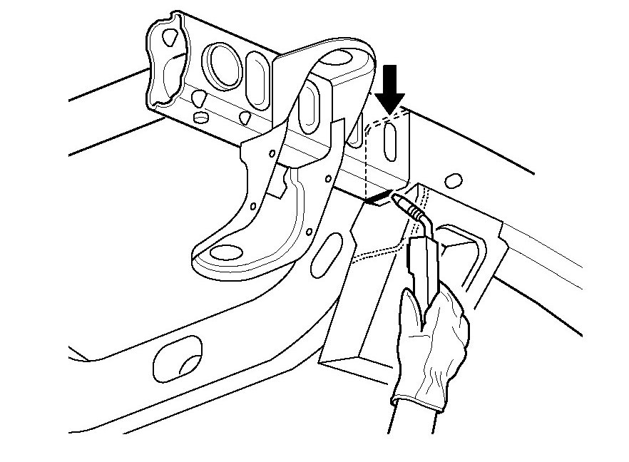 If damage permits, locate and cut off the front portion of the frame assembly (first 420 mm (16 - 1/2 in.) along the die mark indicators and through the sway bar mounting brackets. Front frame service section installation requires replacement of the sway-bar mounting brackets. The front and rear body mounts, radiator support mounts, sway-bar brackets, steering gear and transmission cross-member can be ordered and replaced separately.