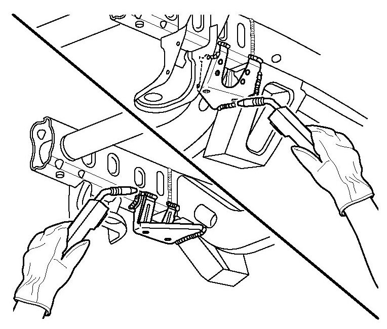 7. Remove and discard the remaining sway bar brackets attached to the undamaged portion of the frame using a cut-off wheel or equivalent tool.