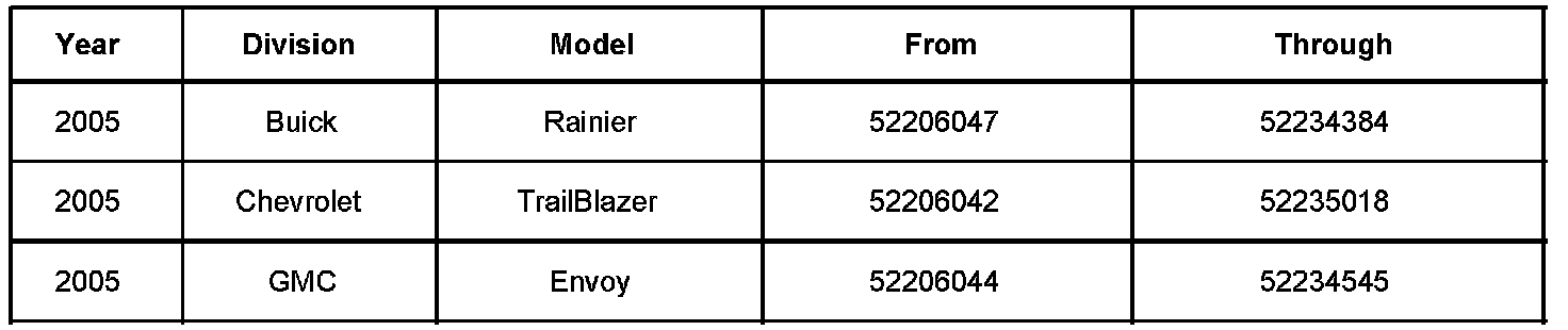 Involved are certain 2005 model year Buick Rainier, Chevrolet TrailBlazer, and GMC Envoy vehicles built within the VIN breakpoints shown.