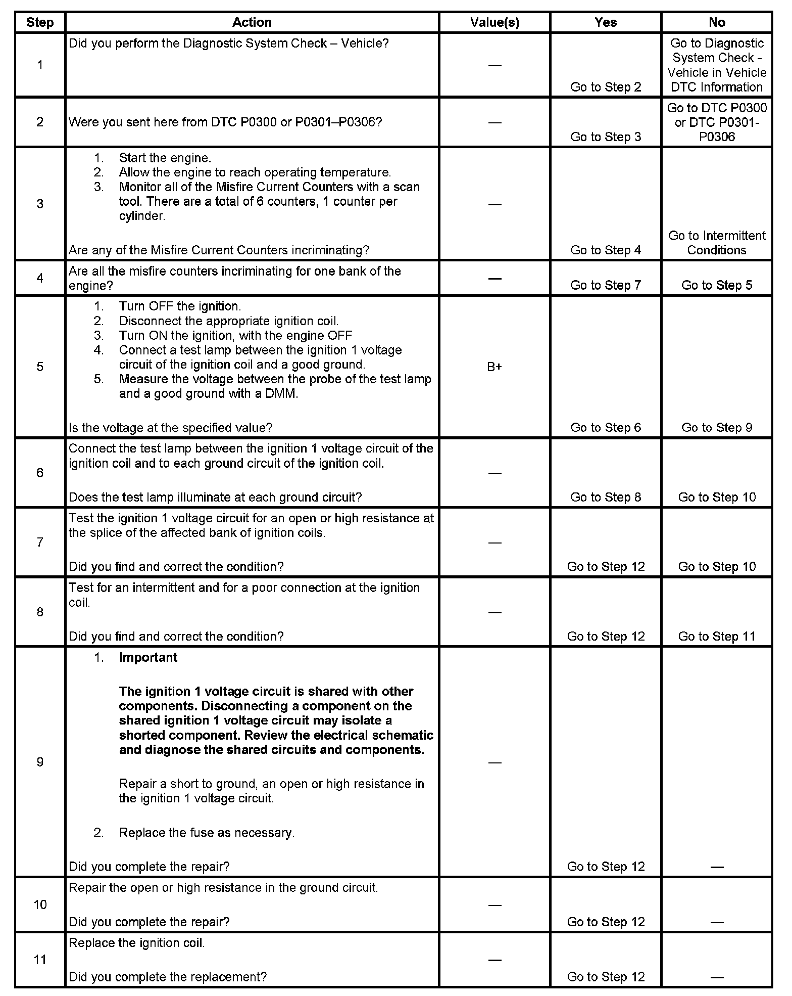 6. This step determines if the ground circuit is open. If the circuit is open, the ignition coils would be inoperative for one bank of the engine.