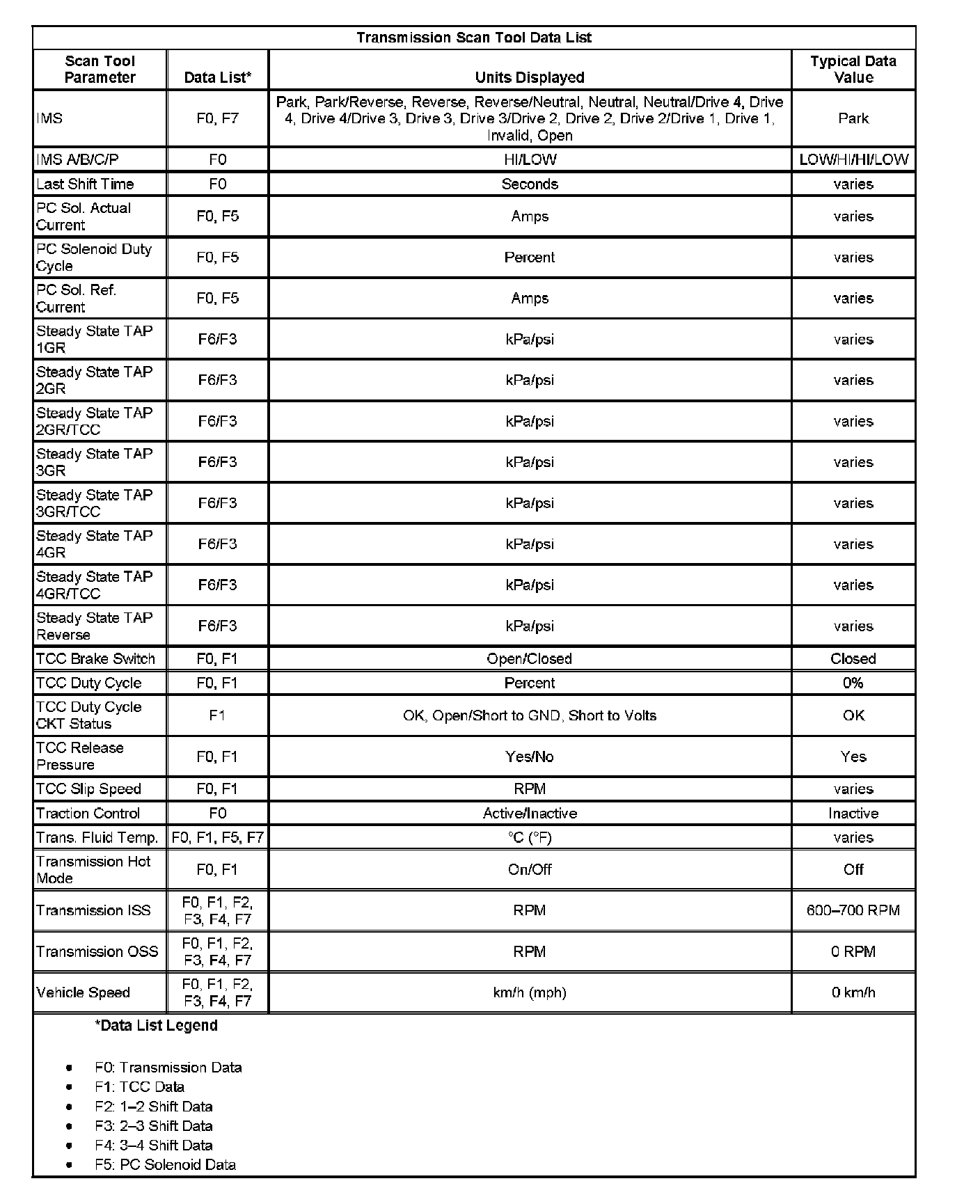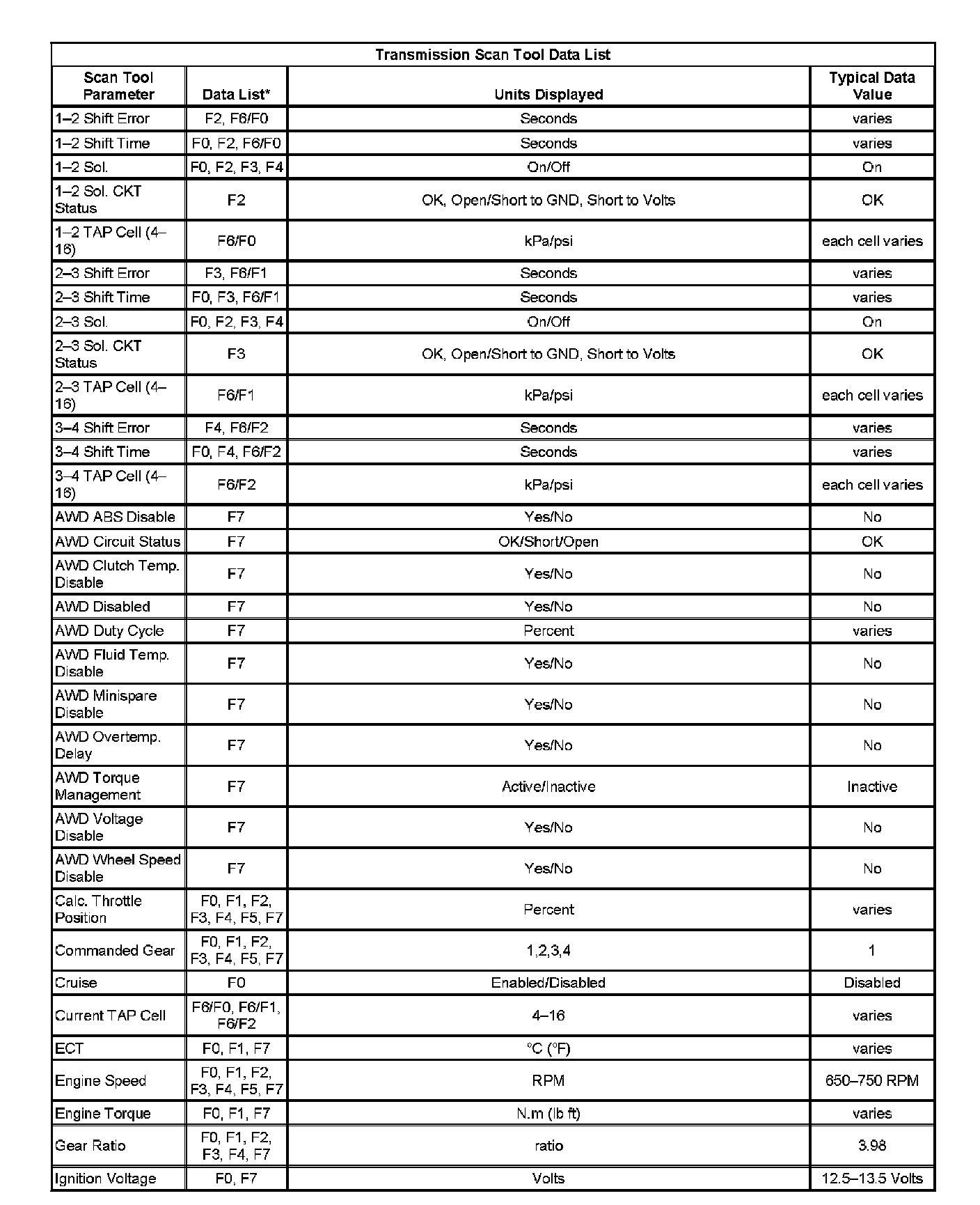 Transmission Scan Tool Data List