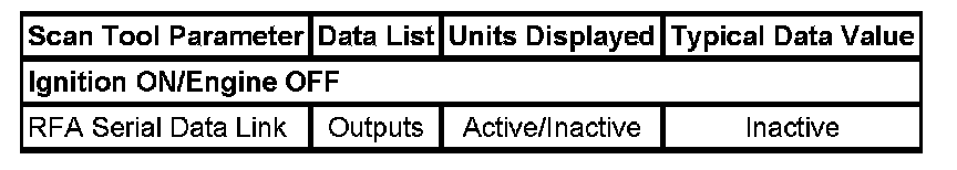 The Keyless Entry Scan Tool Data List contains all of the keyless entry related parameters that are available on the scan tool. The parameters in the list are arranged in alphabetical order. The column, "Data List," indicates the location of the parameter within the scan tool menu selections. Use the Keyless Entry Scan Tool Data List as directed by a diagnostic table or in order to supplement the diagnostic procedures. Begin all of the diagnostic procedures with Diagnostic System Check - Vehicle. Testing and Inspection