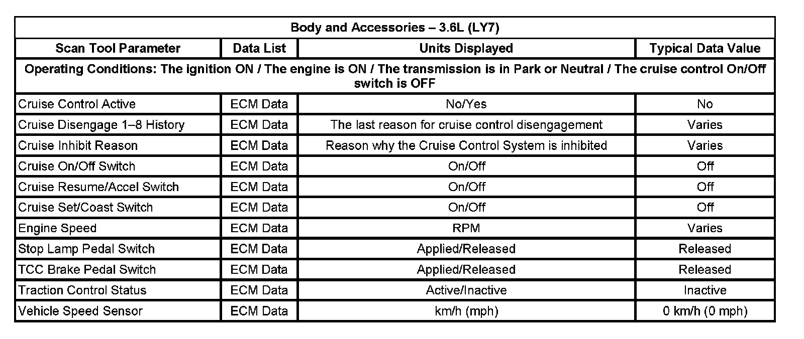 The scan tool data lists contain all of the cruise control related parameters that are available on the scan tool. The parameters in the list are arranged in alphabetical order. The data list column indicates the location of the parameter within the scan tool menu selections.