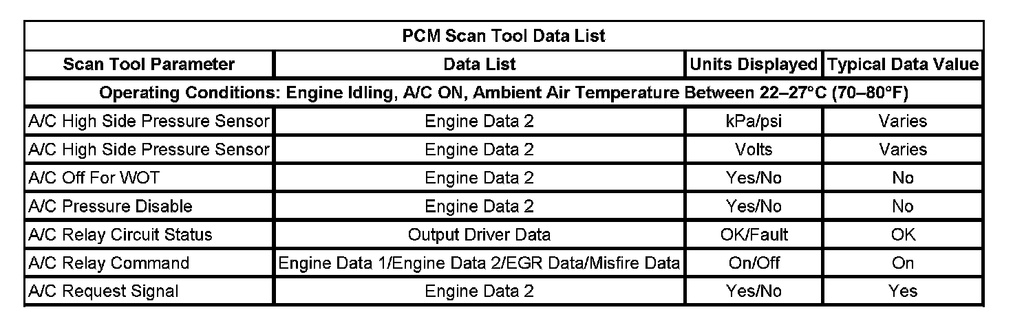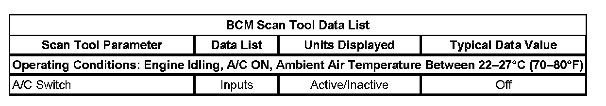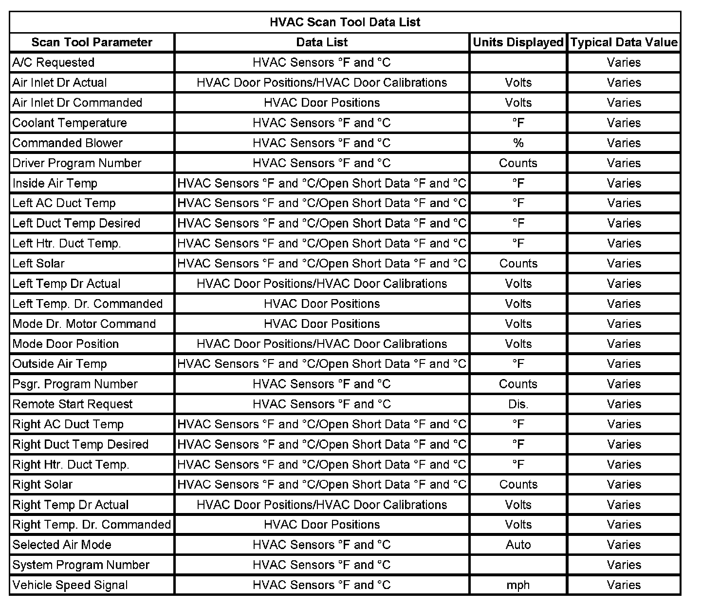 Use the Scan Tool Data Display Values and Definitions Information in order to assist in diagnosing the HVAC system. Compare the vehicles actual scan tool data with the typical data display value table information. Use the data information in order to aid in understanding the nature of the problem when the vehicle does not match with the typical data display values.