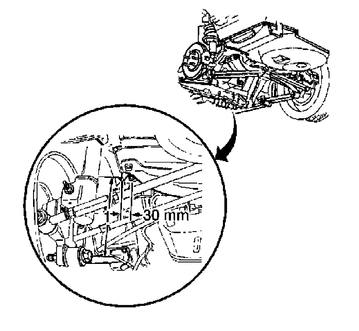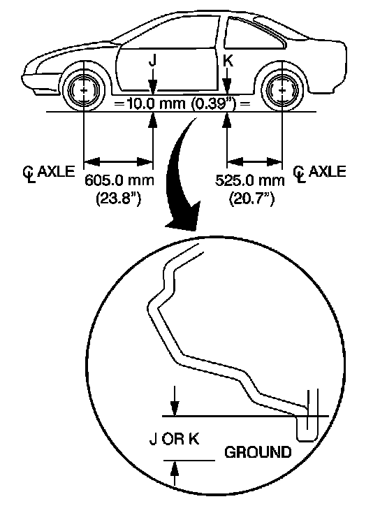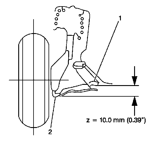 The D Height (represented as 1 on the figure) is measured from a point 30 mm outboard of the rear brake hose bracket bolt centerline to the bolt of the trailing arm to the steering knuckle.