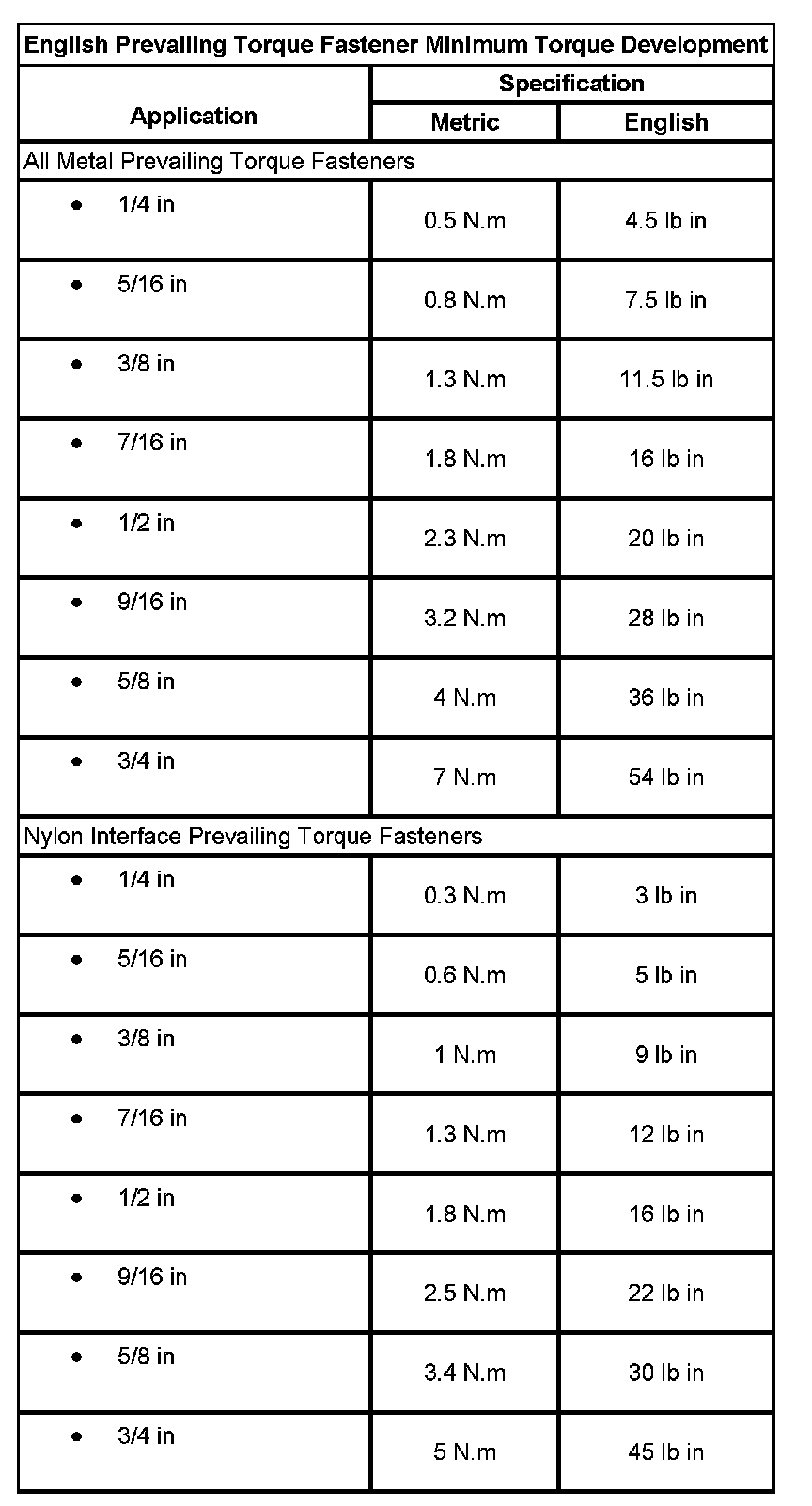 ENGLISH PREVAILING TORQUE FASTENER MINIMUM TORQUE DEVELOPMENT