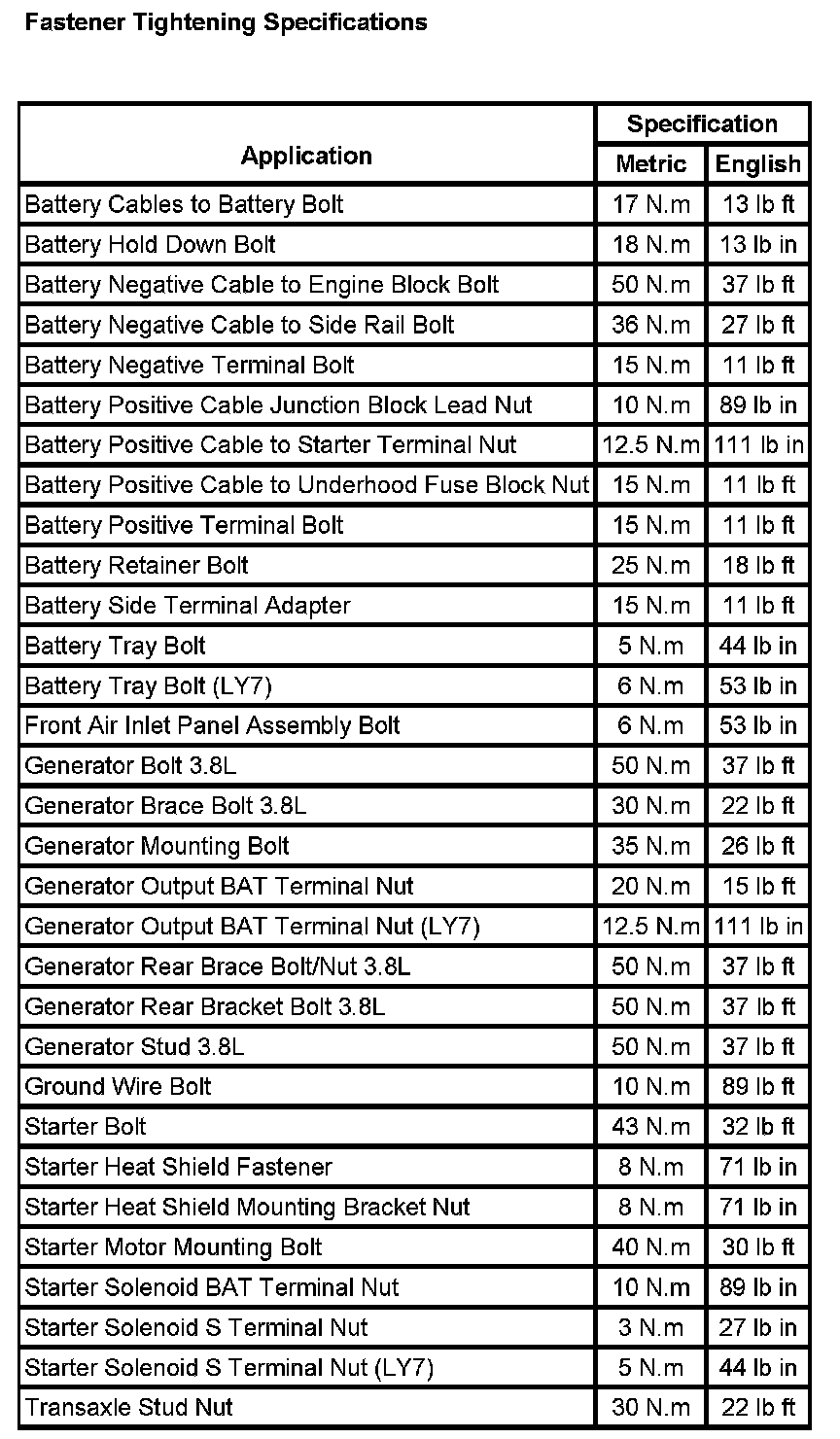 Fastener Tightening Specifications: