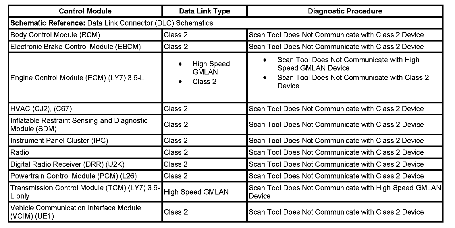 This table identifies which serial data link that a particular module uses for in-vehicle data transmission. Some modules may use more than one data link to communicate. Some modules may have multiple communication circuits passing through them without actively communicating on that data link. This table is used to assist in correcting a communication malfunction. For the description and operation of these serial data communication circuits refer to Data Link Communications Description and Operation.