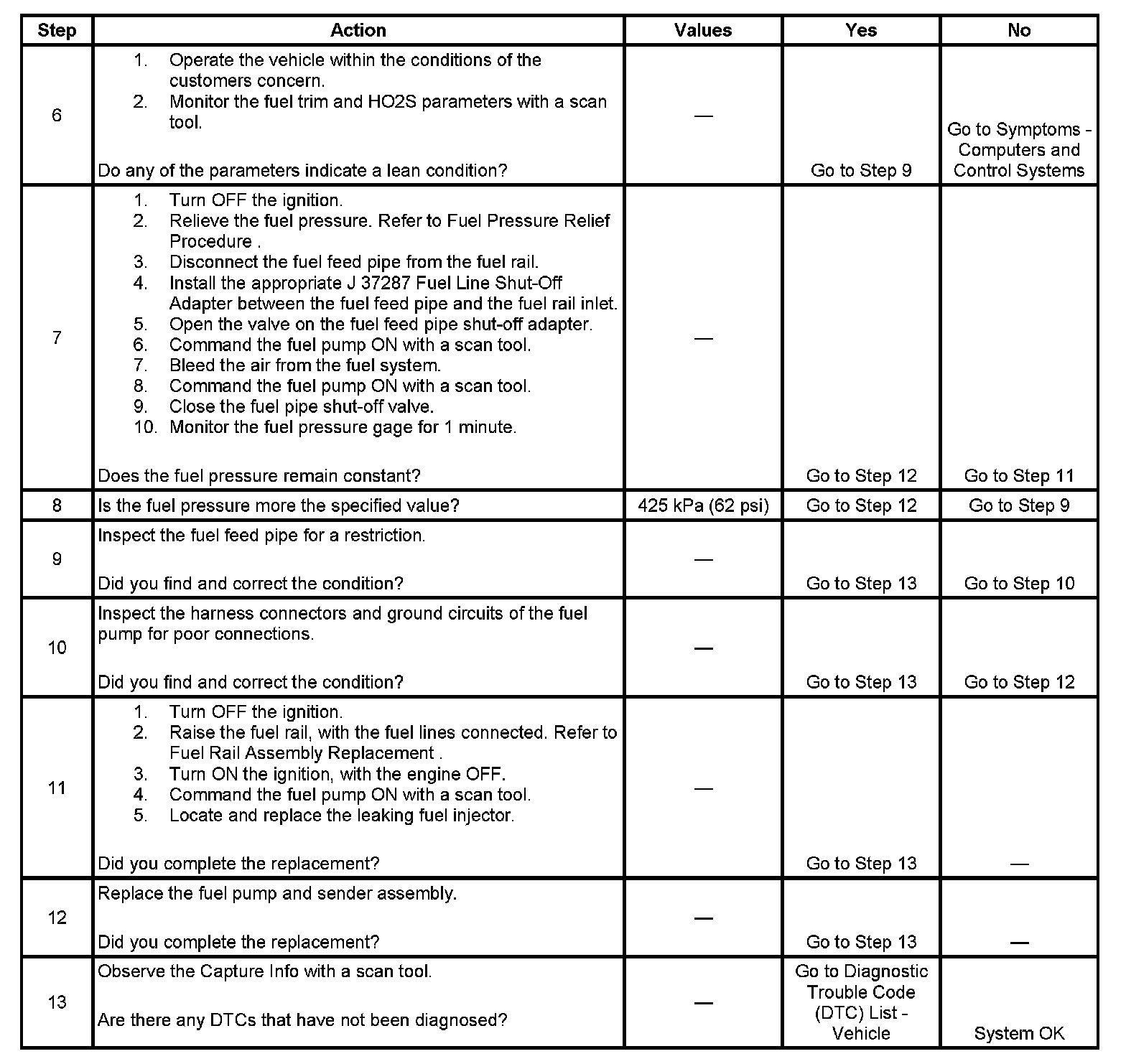 10. This step verifies that a circuit condition is not the cause of a fuel pressure concern. Inspect all fuel pump electrical circuits thoroughly.